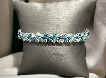 14KWG Lab Created Diamond Bracelet featuring 63 round diamonds =4.26 Cts with F Color and VS Clarity. The light and dark blue lab grown diamonds measure 5x3MM and have a total combined weight of 10.3 Cts. The length is 7″.
