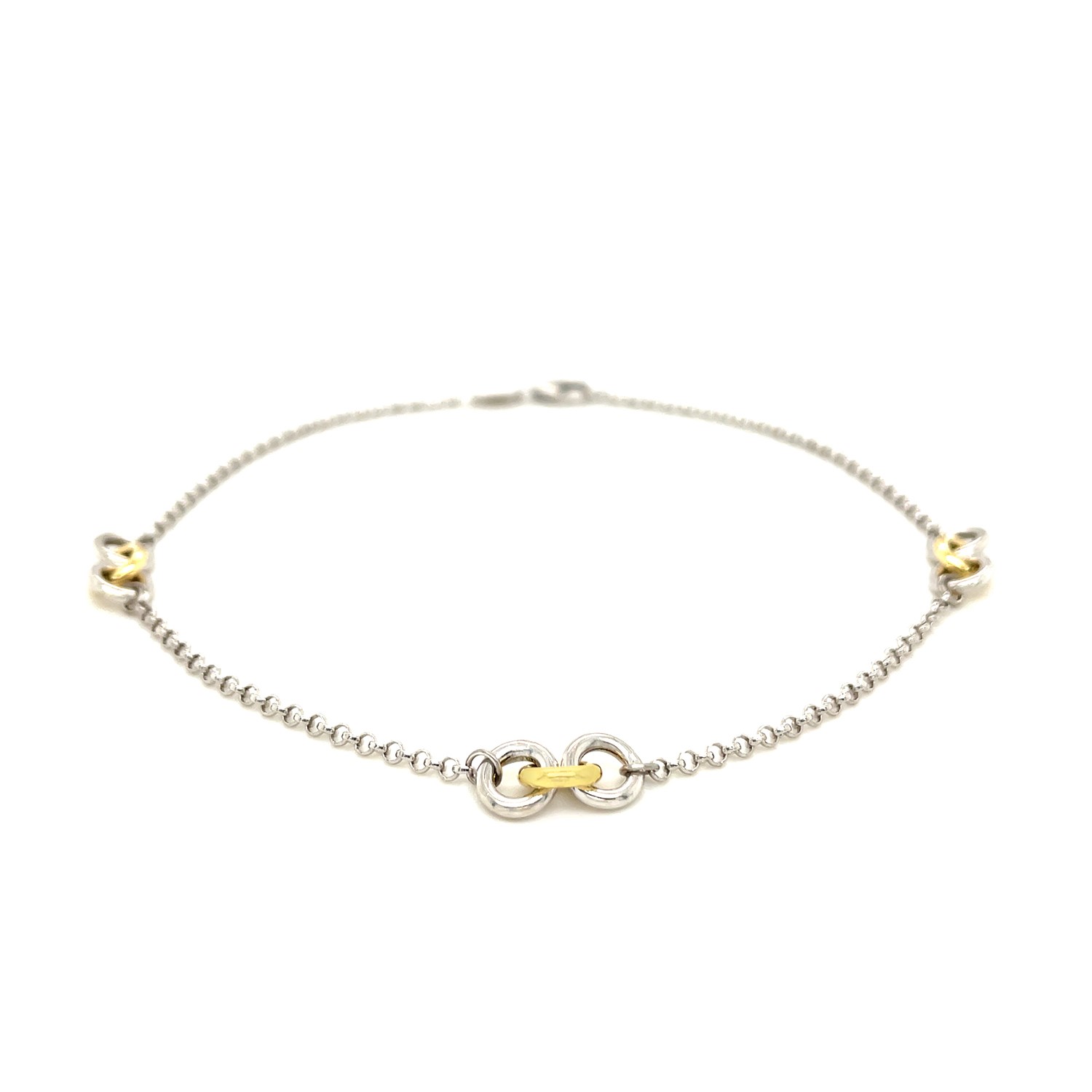 This anklet designed in superb 14k yellow gold and sterling silver. Measuring 10 Inches, this beauty comes with triple entwined ring stations and is secured with a lobster lock.