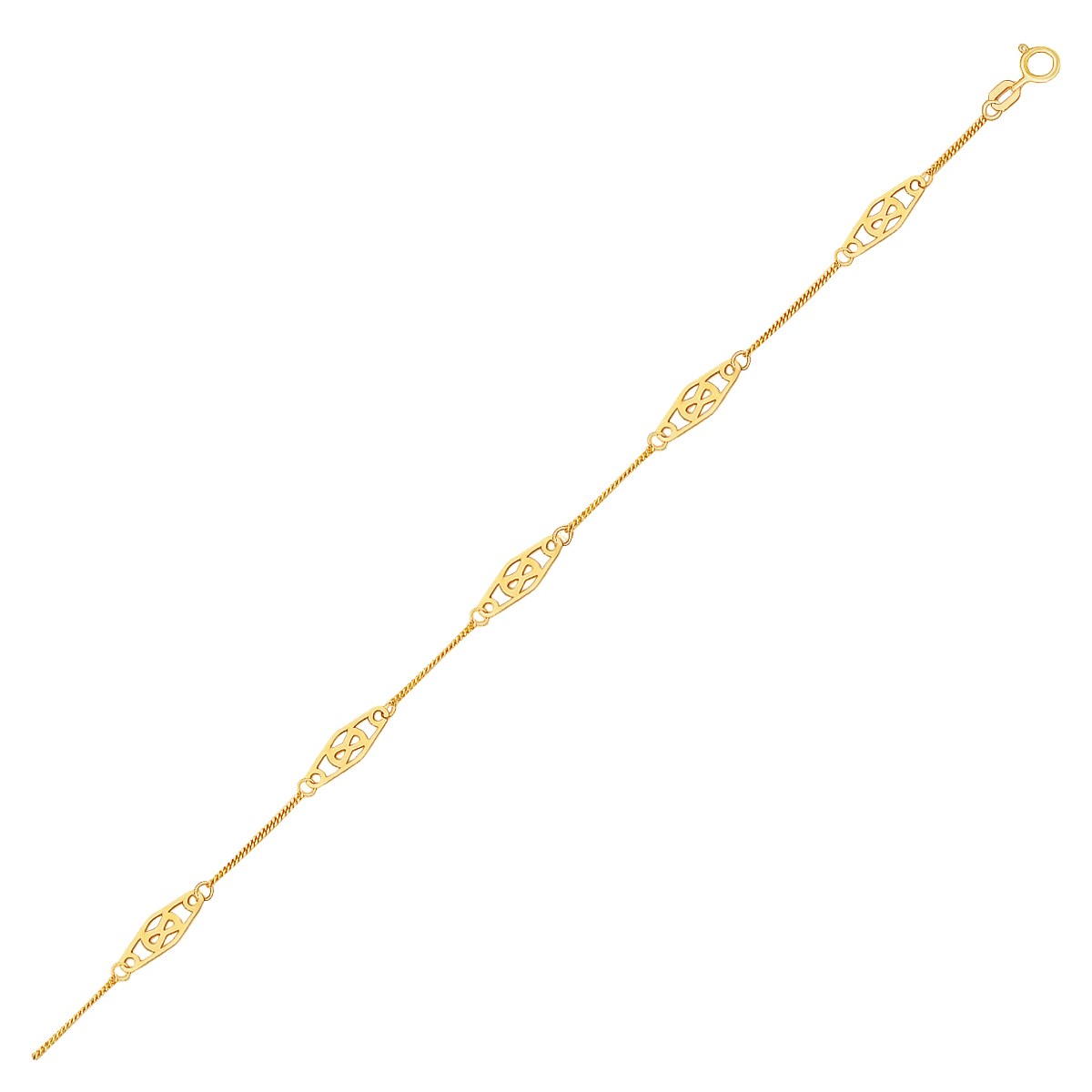Showcasing head-turning diamond shape stations with filigree-like detailing, this darling of a curb chain anklet is quite stylish. Measuring 10 Inches, this 14k yellow gold beauty is secured with a spring ring lock.