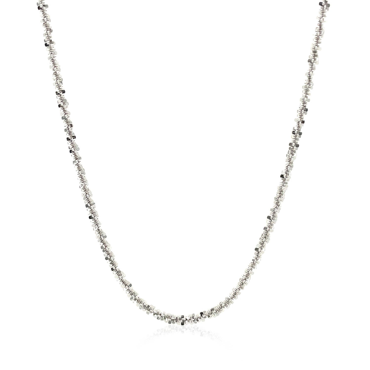 This classic rhodium plated chain is crafted in gleaming sterling silver and has a width of 2.2 millimeters. Featuring a sparkle chain design, it is secured with a lobster clasp.