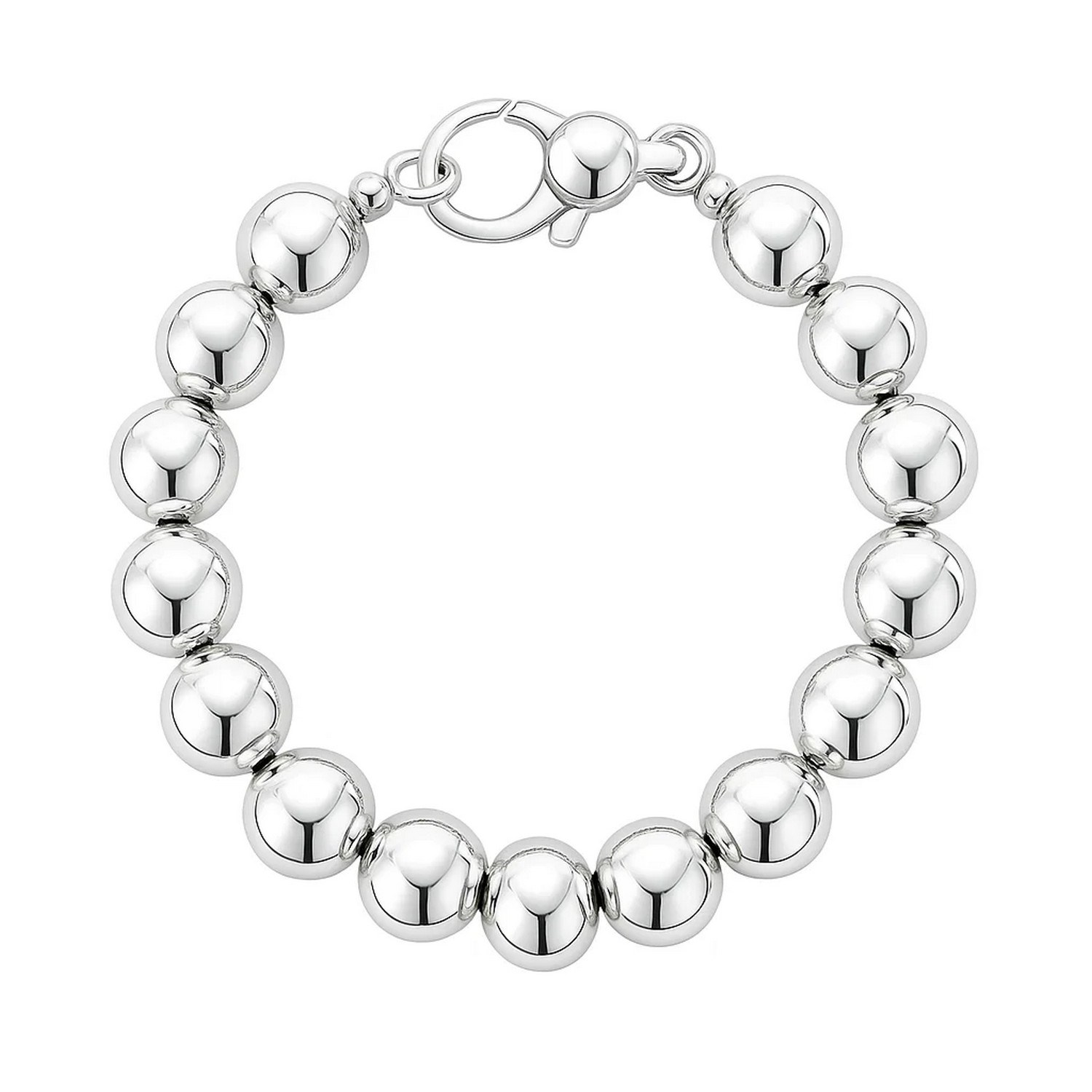 Sterling silver bracelet with polished bold beads measuring 10.00 millimeters in width and featuring a lobster clasp closure enhanced with rhodium plating. Available in measures 7 1/2 inches.