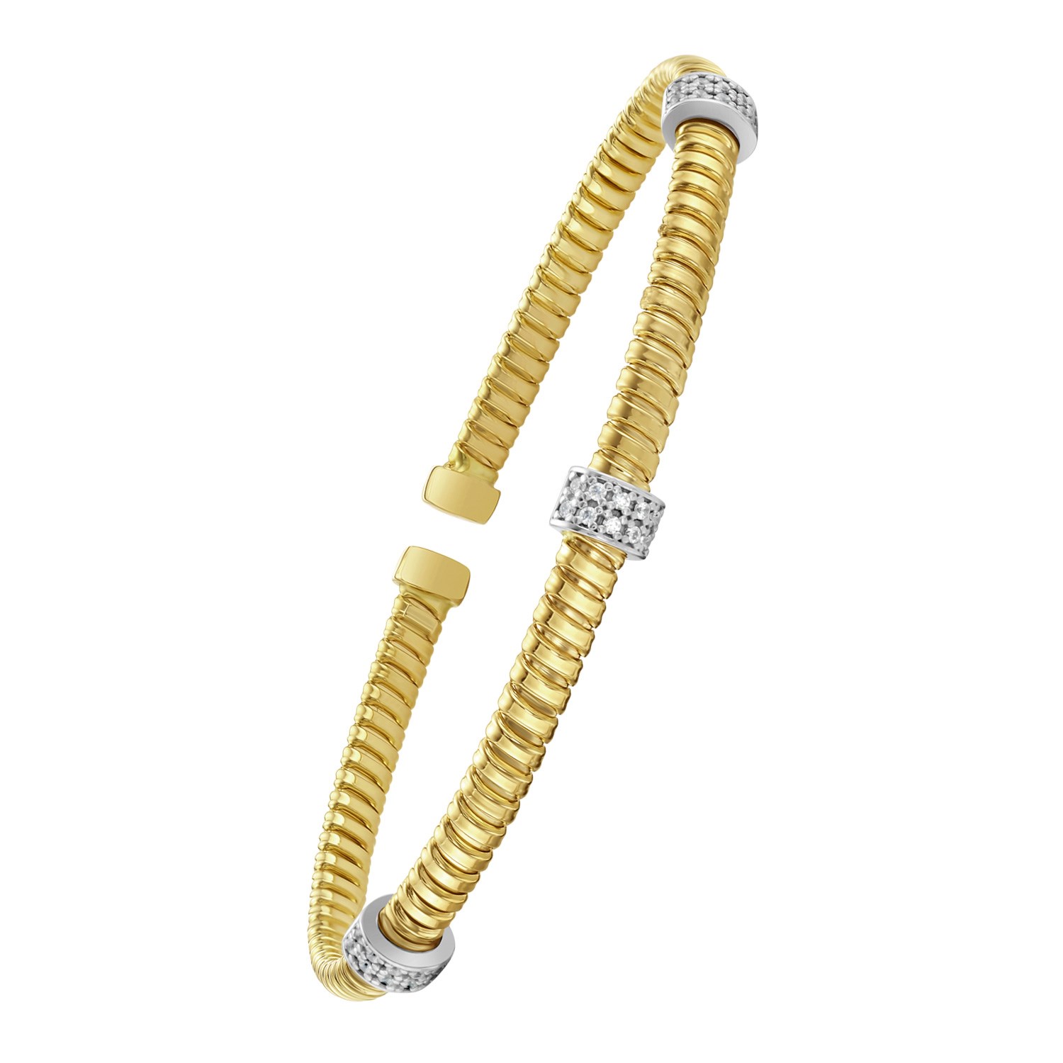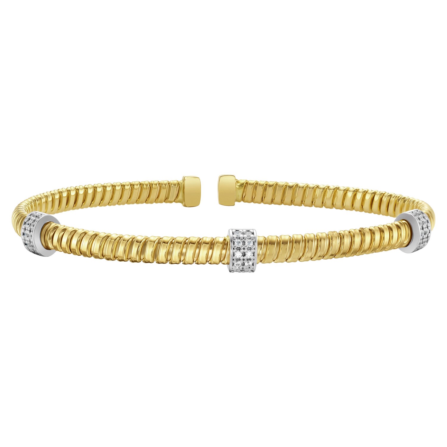 A sleek and modern Tubogas cuff bracelet crafted in polished 14K yellow gold. This flexible, slip-on design features three sparkling diamond stations, adding a refined touch of brilliance. The bracelet offers effortless wear and a comfortable, secure fit. A timeless piece perfect for stacking or making a statement on its own.