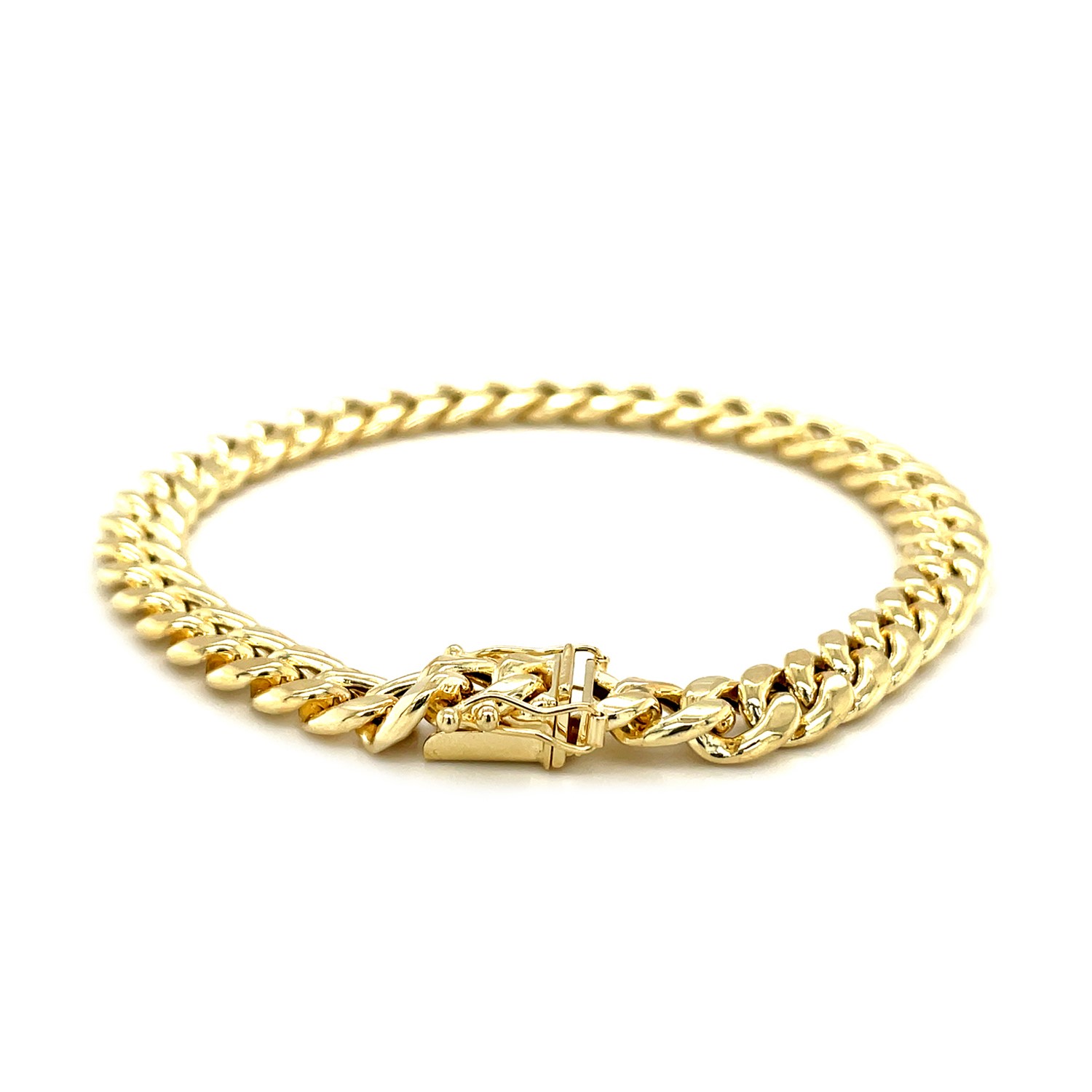 This semi solid Miami Cuban bracelet comes in 14k yellow gold and has a width of 7.5 millimeters. Secured with a box clasp.