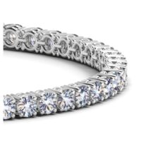 14 karat white gold lab created diamond tennis bracelet featuring 58 round diamonds set in 4 prongs weighing 7.33 carats in total with F color and VS Clarity measuring 7″ in length.