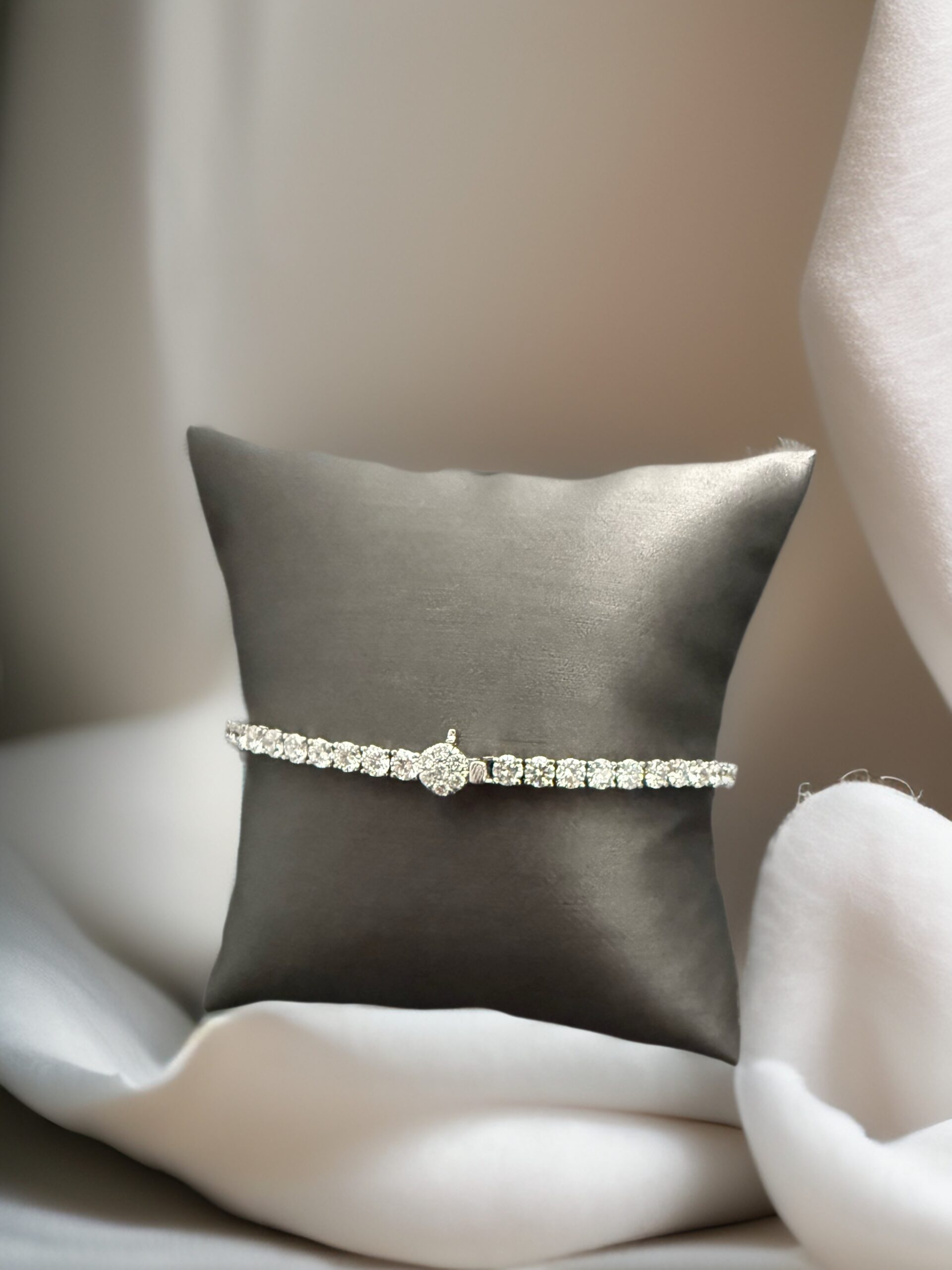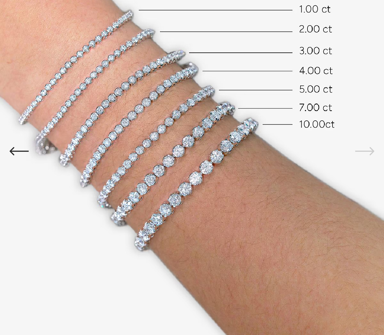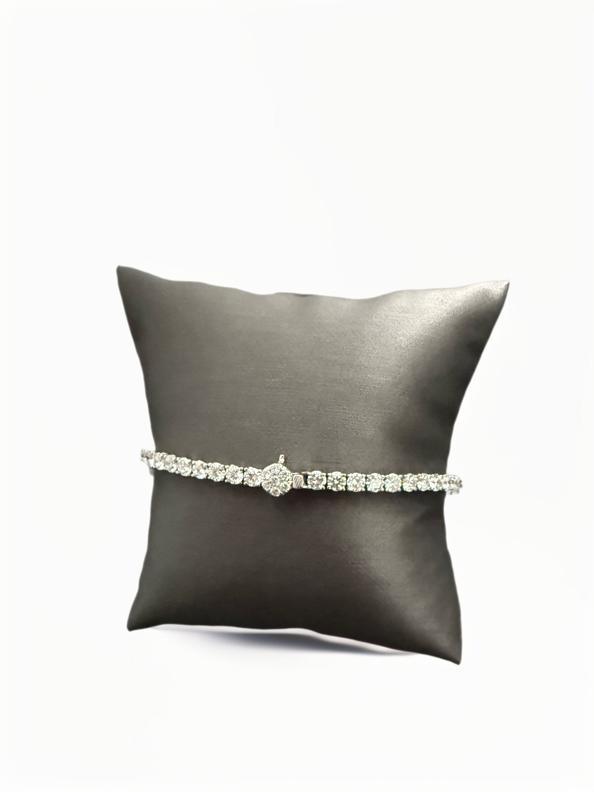 14KWG Lab Created diamond tennis bracelet featuring 58 round diamonds set in 4 prongs weighing 7.33 cts with F color and VS clarity. The total length is 7″.