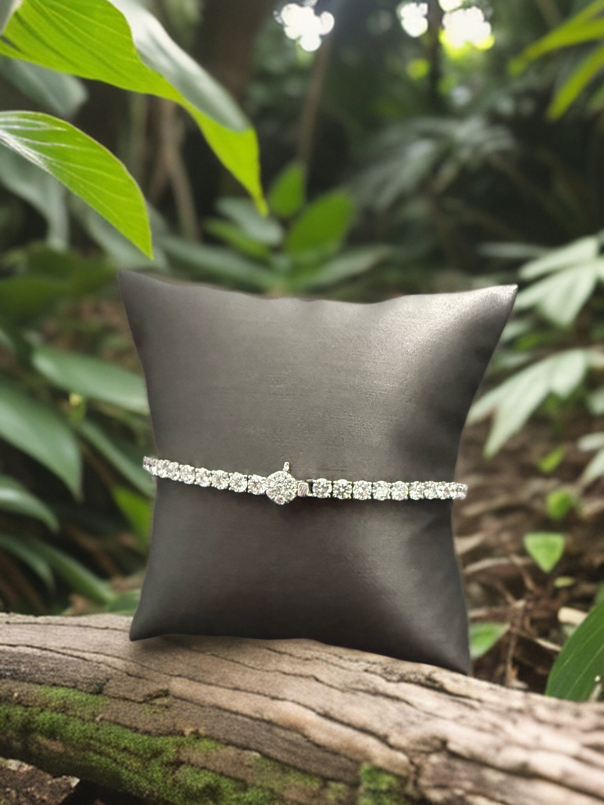 14 karat white gold lab created diamond tennis bracelet featuring 58 round diamonds set in 4 prongs weighing 7.33 carats in total with F color and VS Clarity measuring 7″ in length.