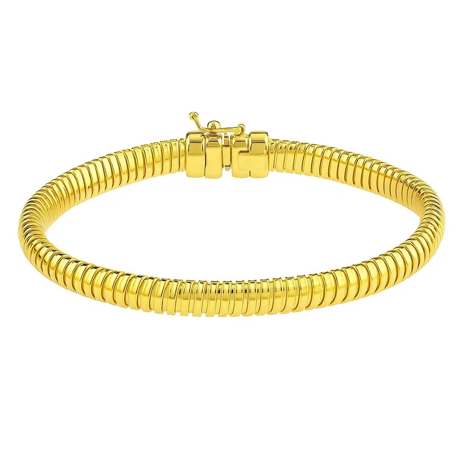 Redefine everyday style with our 14k yellow gold tubogas bracelet, where the interplay of fluid lines and refined artistry set a new standard in luxury. This 7 inchesh piece, emitting a warm gold, features smooth, 5mm-wide tubular links that gracefully encircle your wrist. Seamlessly fusing modern minimalism with artisan precision, it captures light with subtle brilliance, making it a contemporary statement of understated luxury for any occasion.