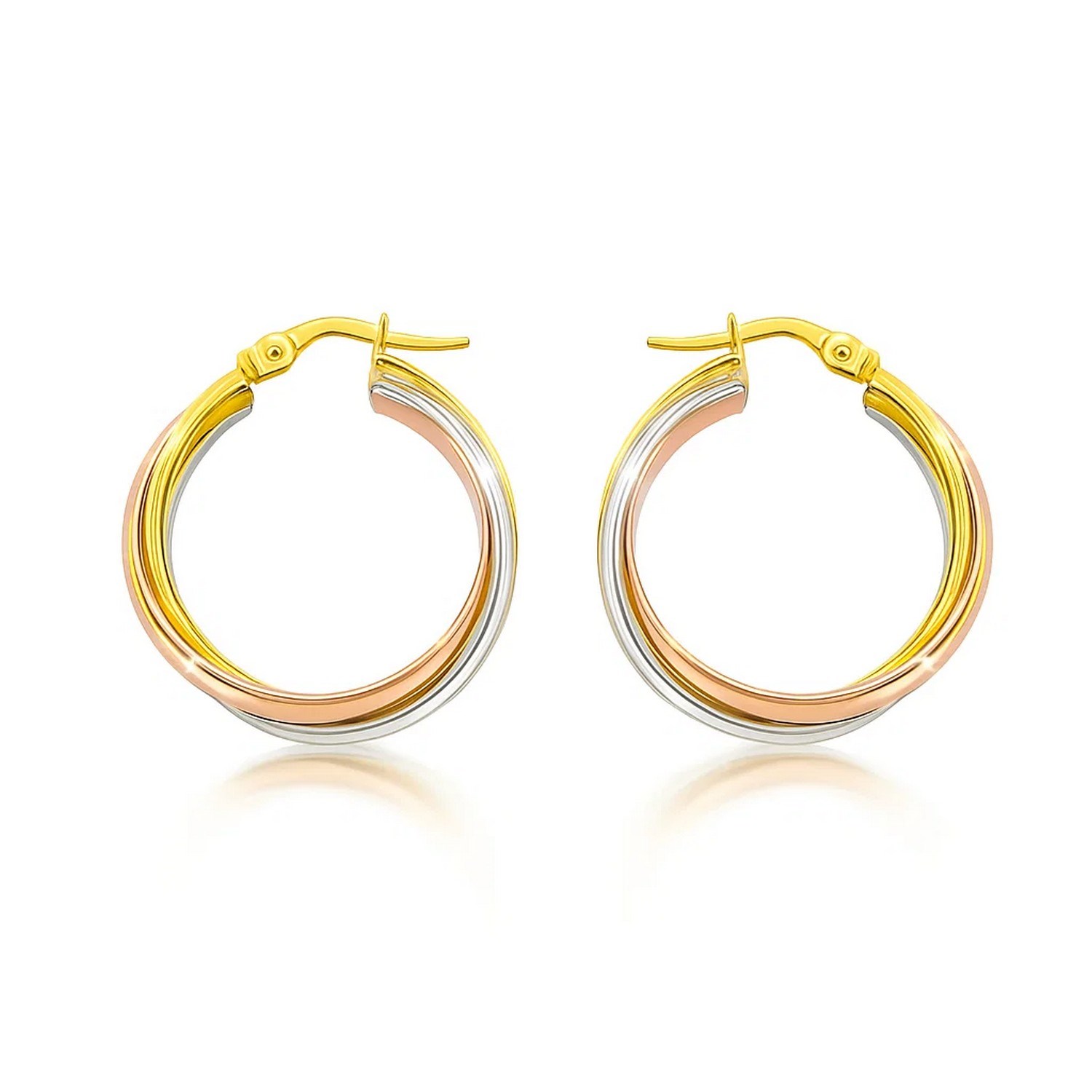 Elevate your elegance with these 14K tri-color gold woven hoop earrings. Featuring an intricate design that seamlessly blends yellow, white, and rose gold strands, these hoops offer a sophisticated twist on a classic accessory. The hinged clasp ensures a secure and comfortable fit, making them perfect for both everyday wear and special occasions. Add a touch of timeless beauty to your jewelry collection with these versatile earrings.