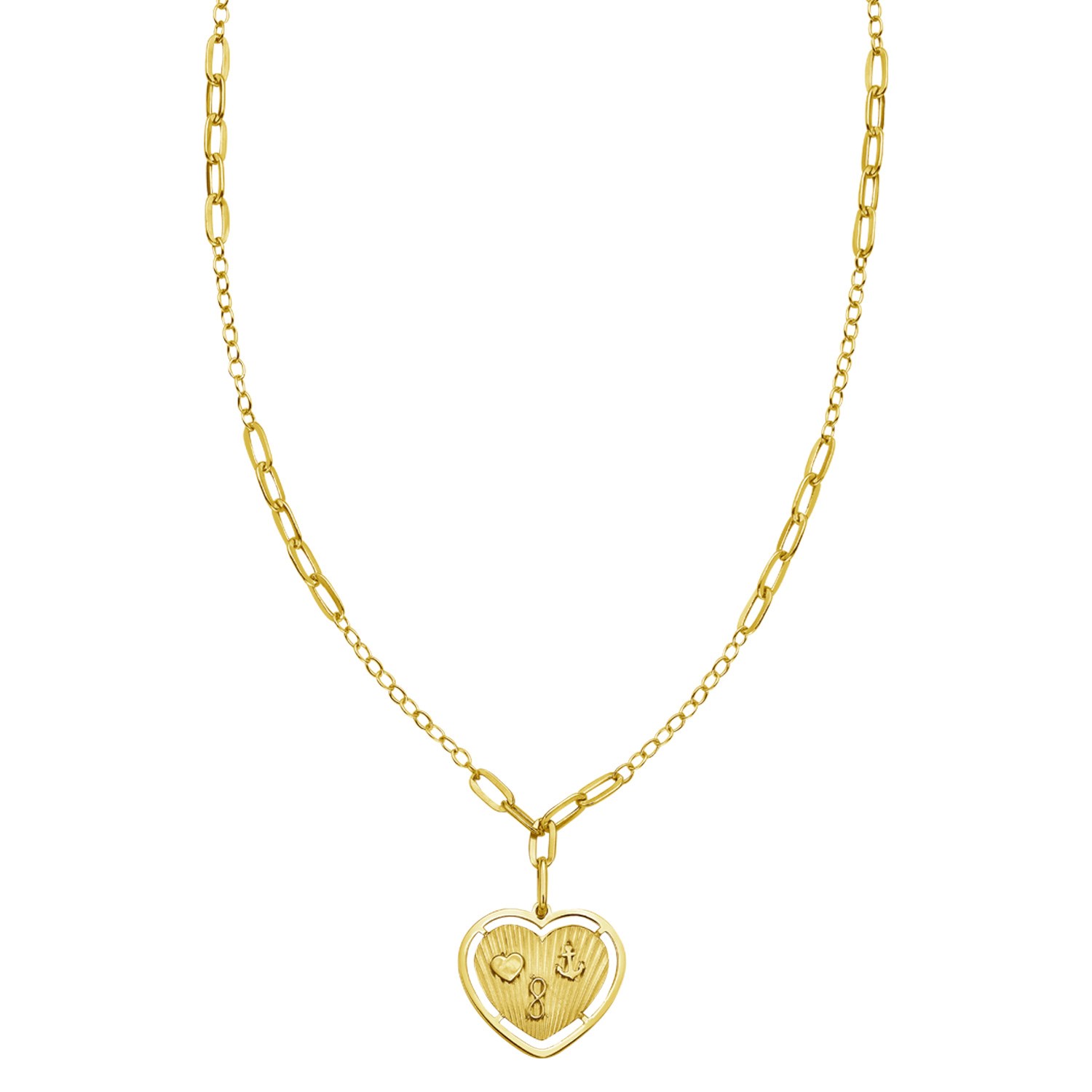Introducing our 14K Yellow Gold Lucky Forever Heart Necklace, a harmonious blend of elegance and symbolism. This exquisite piece features a polished and textured heart pendant adorned with lucky symbols, representing eternal fortune and love. The pendant is gracefully suspended from a delicate link chain, secured with a spring ring clasp for reliable wear. Measuring 18 inches in length, this necklace sits beautifully on the neckline, making it a perfect accessory for any occasion. Elevate your jewelry collection with this meaningful and stylish piece, ideal for personal wear or as a heartfelt gift.