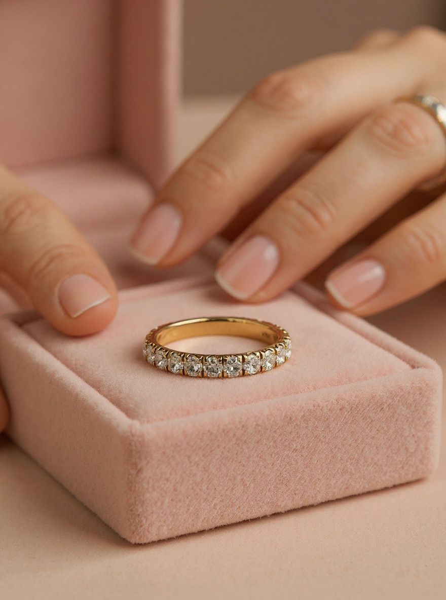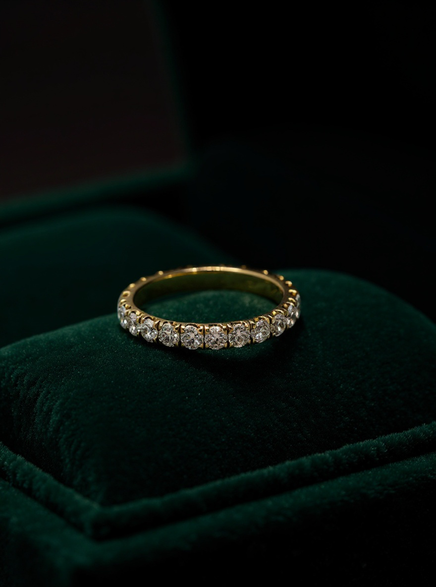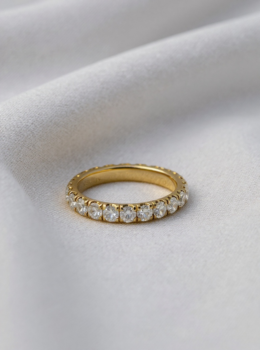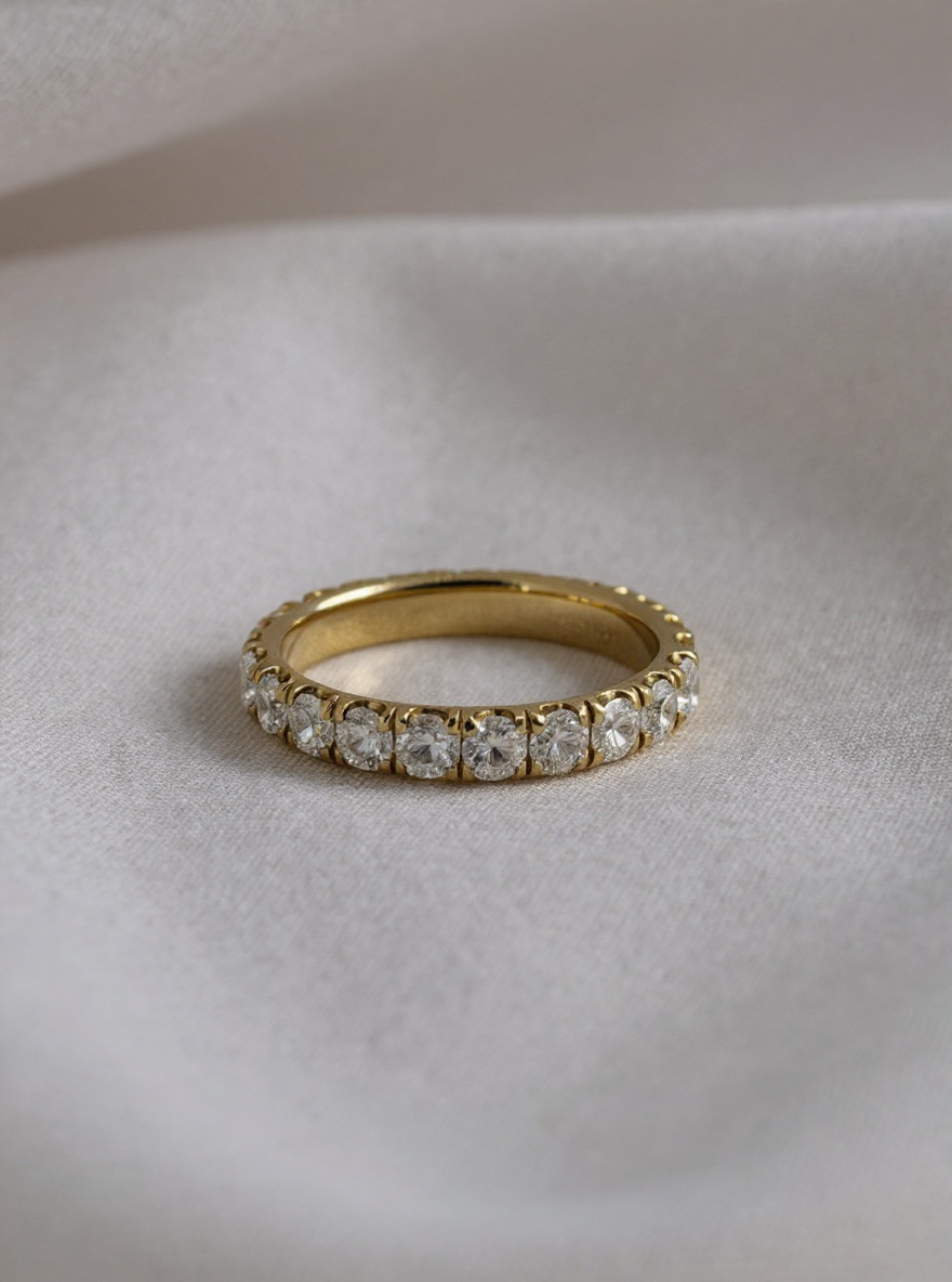 14 karat yellow gold eternity ring featuring 22 round lab created diamonds, French set, weighing 1.76 carats with F color and VS Clarity.