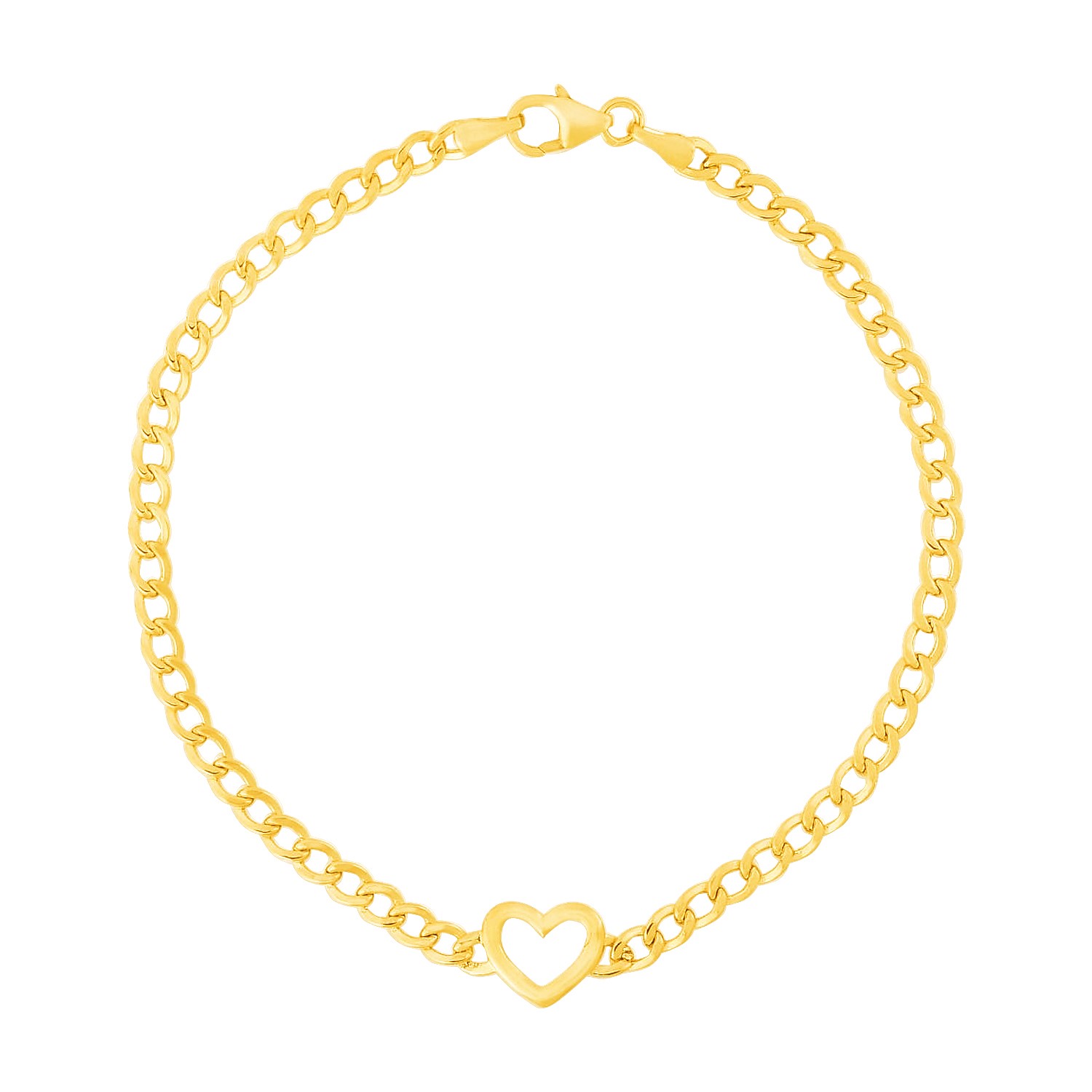 A single polished heart adorns lovely curb chain in this exquisite 14k yellow gold bracelet. Bracelet is 7 inches long and closes with a lobster clasp.