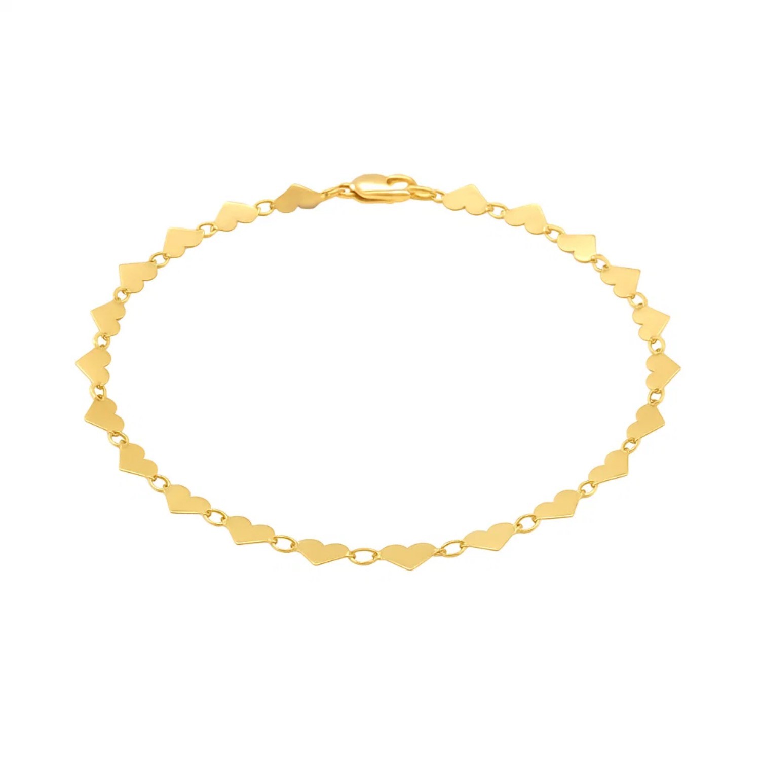This bracelet features a bright, happy collection of shiny hearts, illuminated by the brilliant shine of 14k yellow gold. Bracelet is 7 inches long and closes with a lobster clasp.