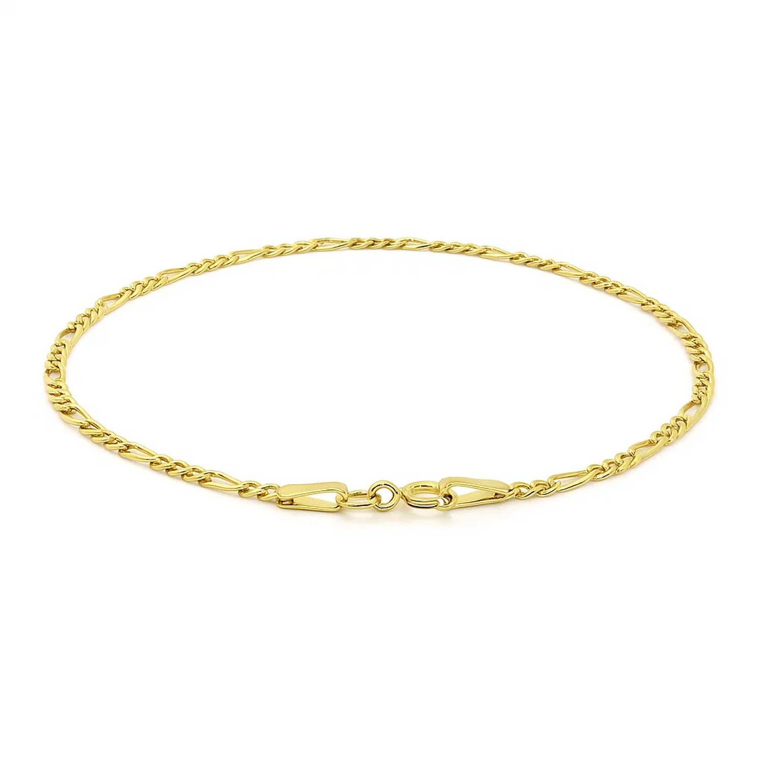 Crafted in glistening 14k yellow gold, this Figaro bracelet has a width of 1.9 millimeters and is secured with a spring ring clasp