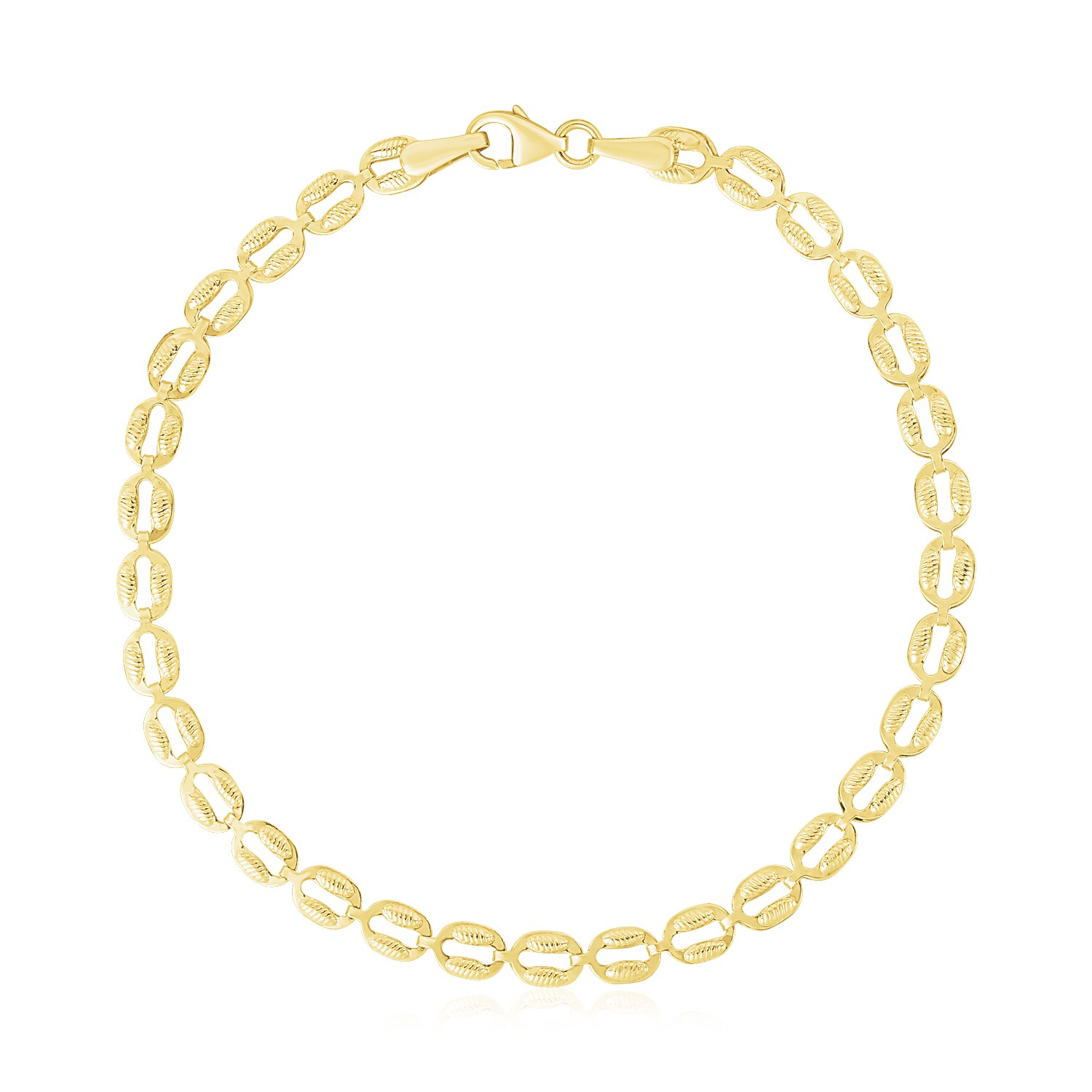This Textured Puffed Oval Link bracelet is a unique addition to complete that certain style. Crafted in 14k yellow gold with a high polish finish & a lobster clasp closure. Measuring 3.8 mm width & available in a 7 inches length.
