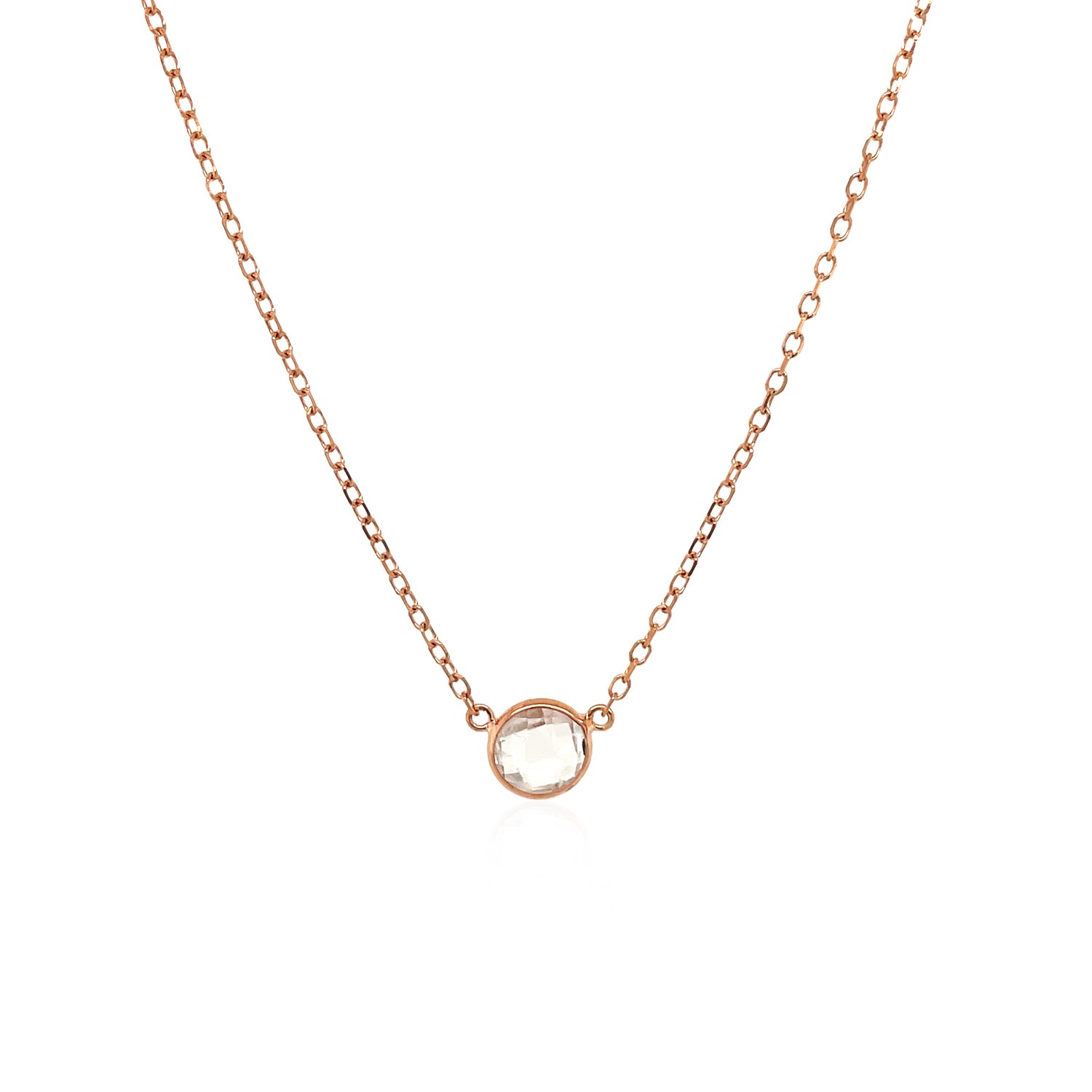The beautiful spring-like green of a fine round white topaz adds a splash of color and glimmering depth to this classic 14k rose gold necklace. Necklace is 17 inches long and closes with a spring ring clasp. Peridot is 6mm in diameter.