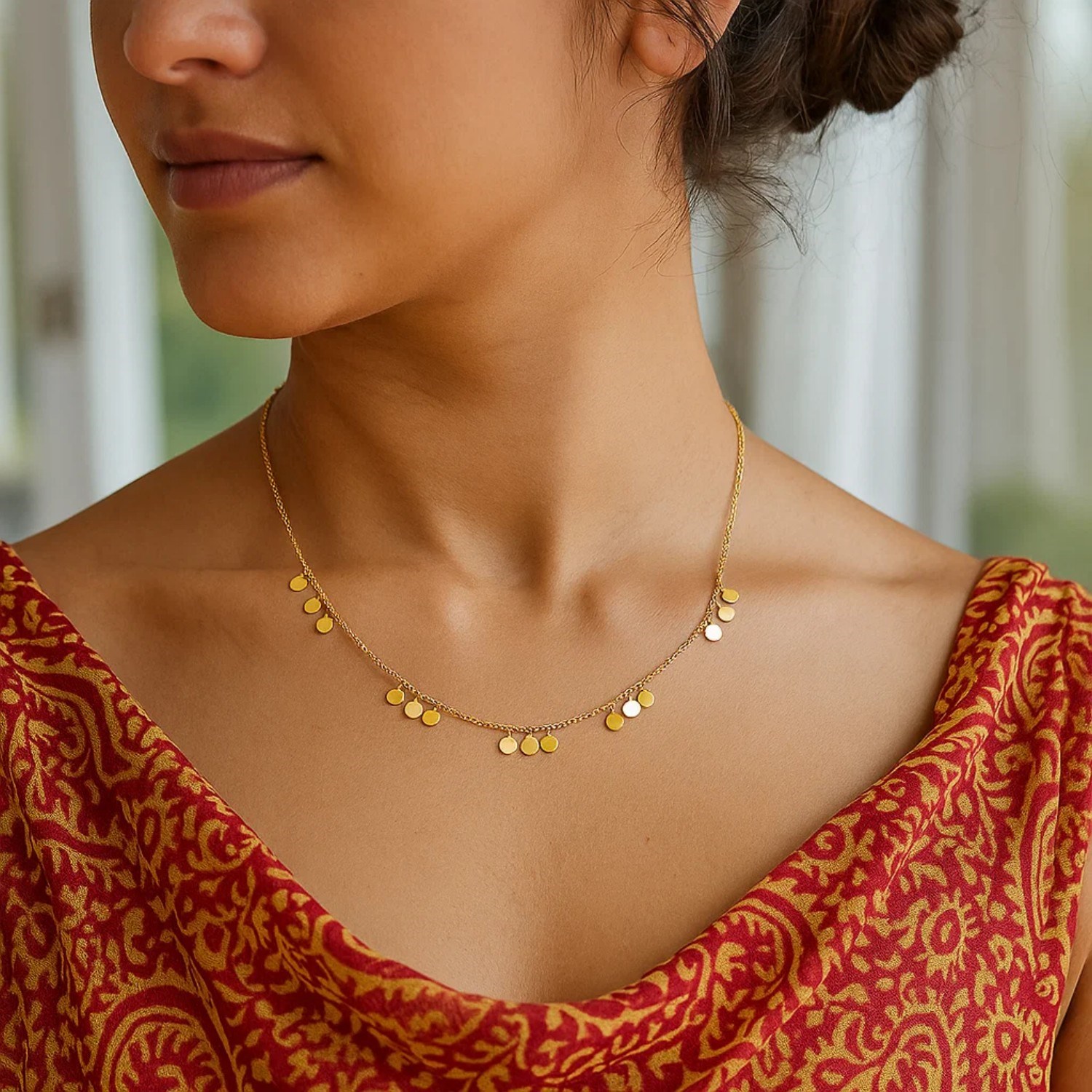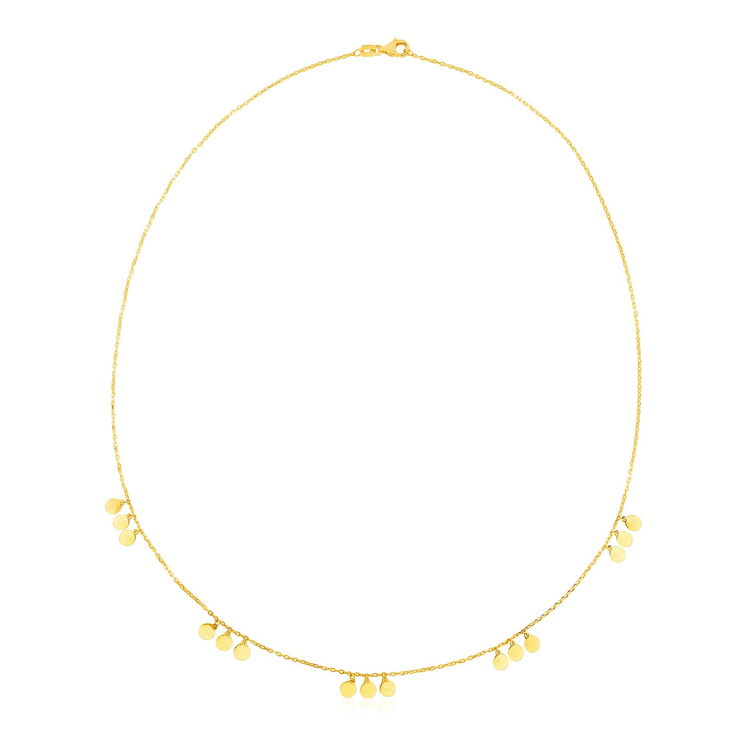Bright circles swing and dance as they hang from this exquisite 14k yellow gold chain necklace. Necklace is 18 inches long.