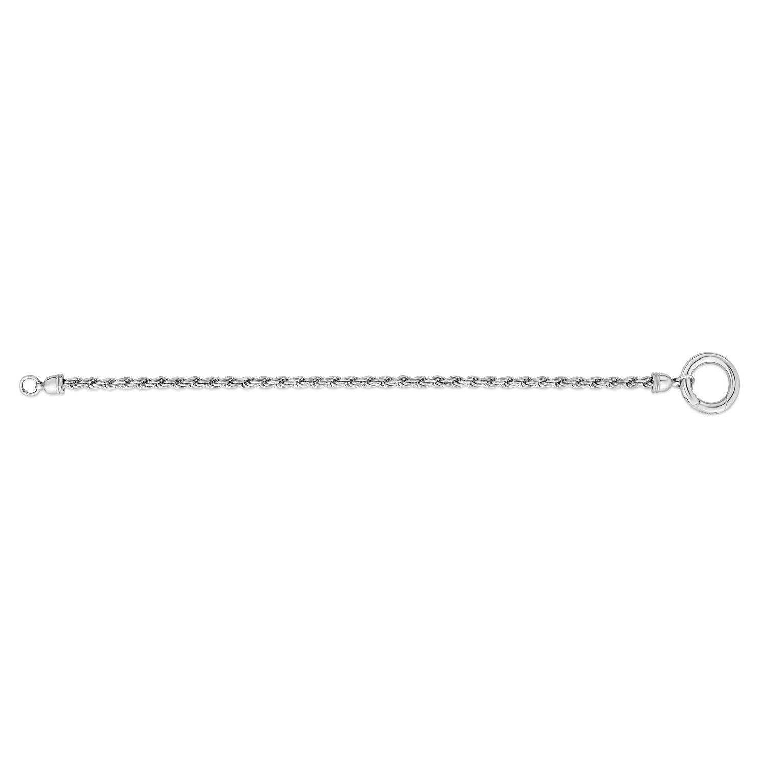 This necklace showcases a classic rope chain crafted in sterling silver and finished with rhodium plating for lasting shine, highlighted by a stylish fancy push-lock clasp. Elegant and secure, it adds a refined touch to any jewelry collection.