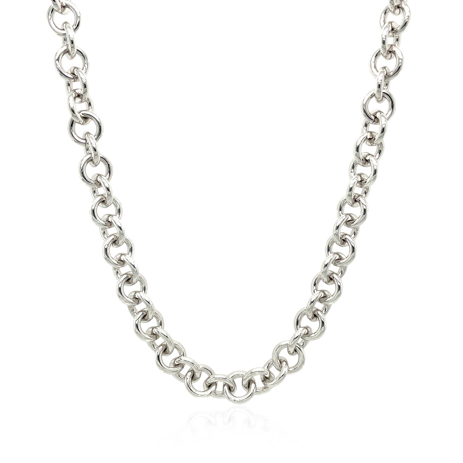 Cute heart motif charm is hanging from the toggle lock accents the adorable style of this rolo chain necklace. Crafted in rhodium plated sterling silver this necklace comes in 16 inches and 18 inches.