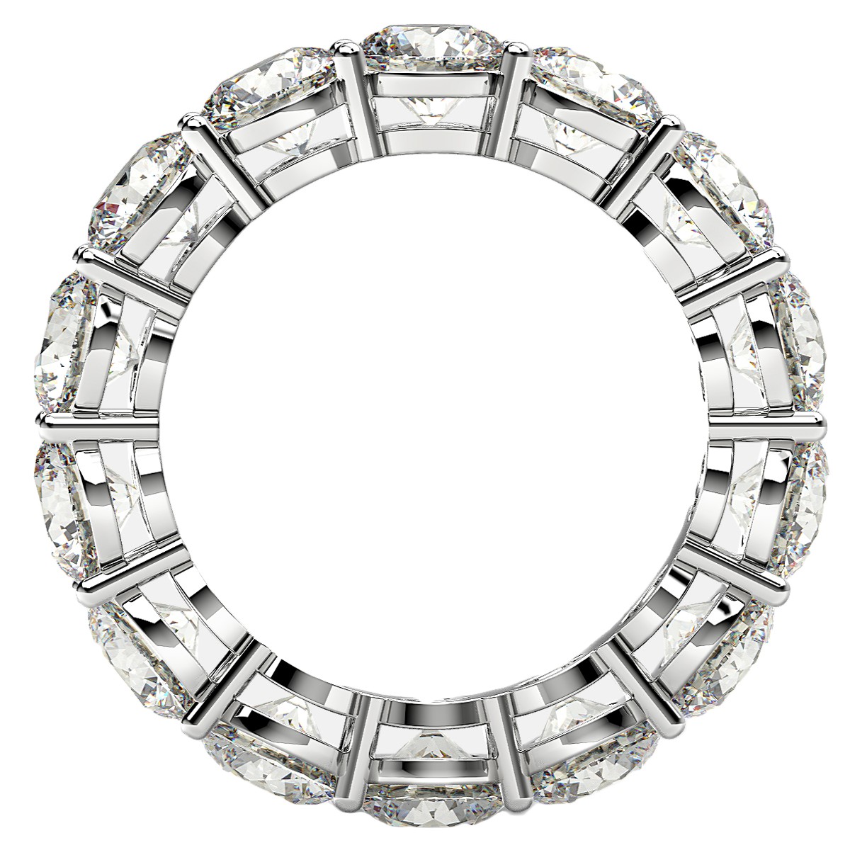 This timeless common prong eternity ring set in 14k white gold features the sparkle of brilliant round cut lab grown diamonds, while open gallery sides allow additional views of the stones.