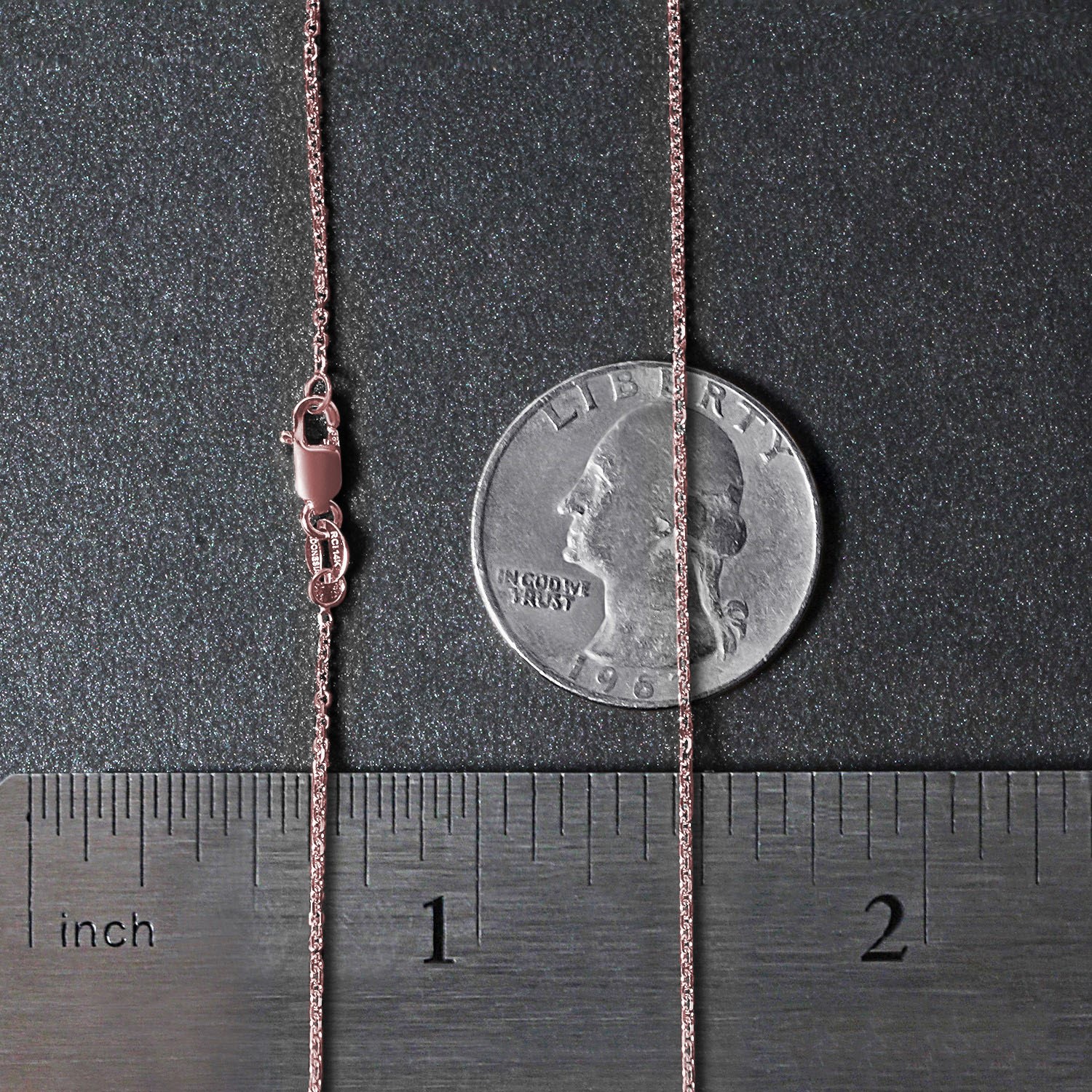 This diamond cut cable link chain comes in 14k rose gold and has a width of 1.10 millimeters.