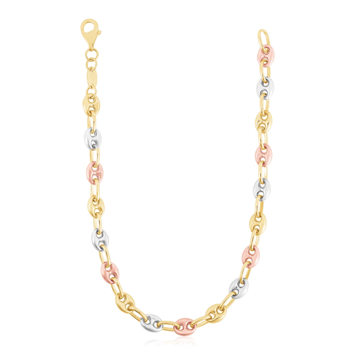 This Tri Color Puffed Mariner link chain is beautifully crafted in 14k tri-color gold with a high polish finish and closes with a lobster clasp.