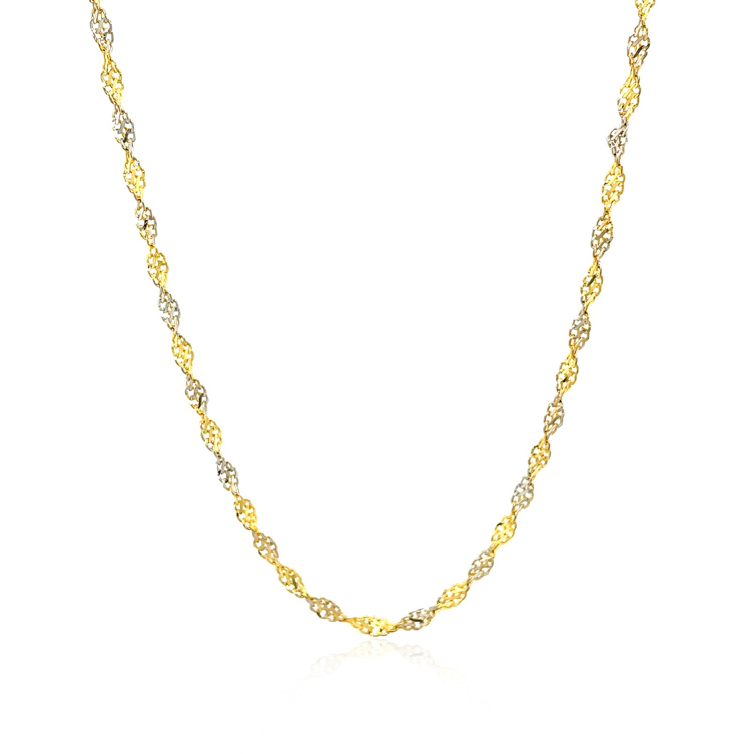 This Singapore chain comes in 14k two-tone gold and has a width of 2.50 millimeters.