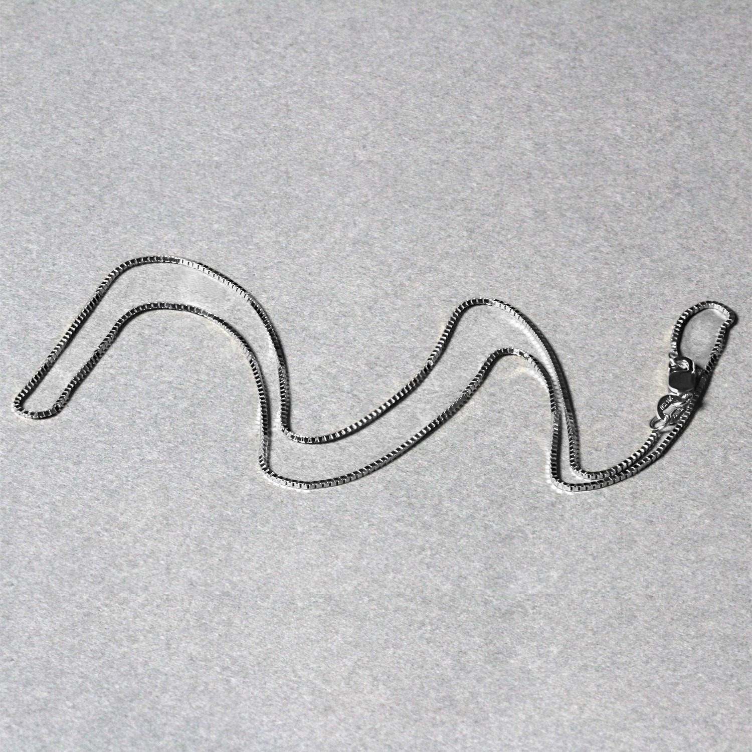 This classic box chain comes in 14k white gold and has a width of 0.75 millimeters.