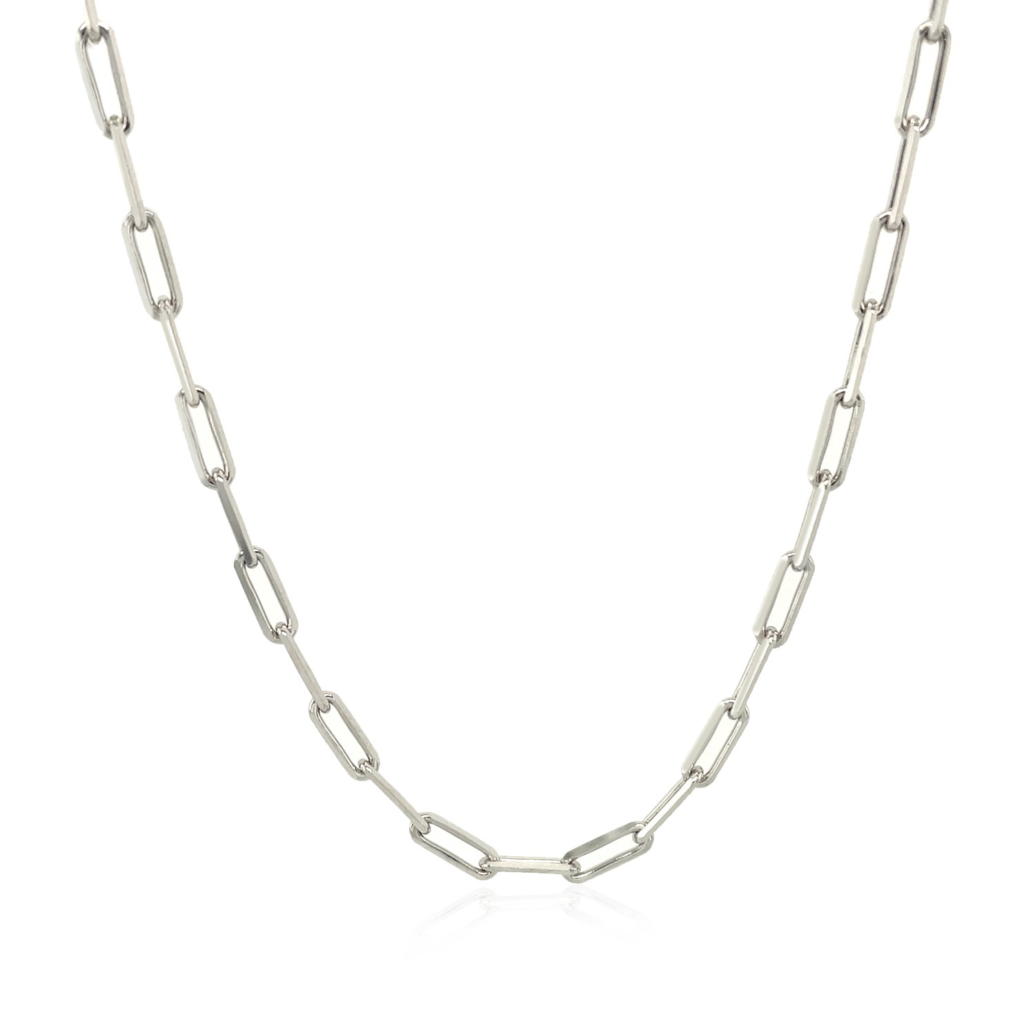 Bright 14K white gold is the star of this exquisite contemporary paperclip chain. Chain has 2.5mm wide links and closes with a lobster clasp.