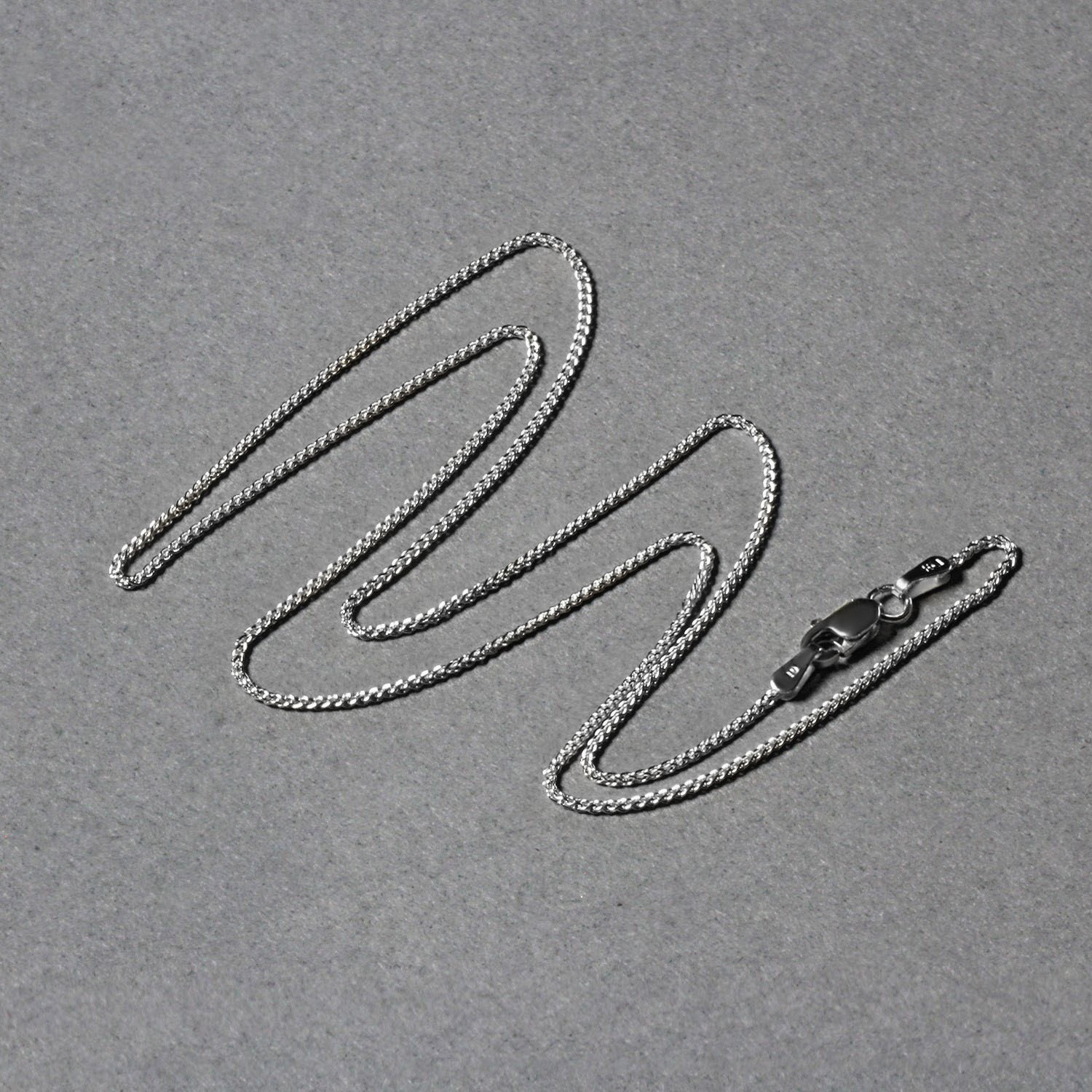 This round wheat chain comes in 14k white gold and has a width of 1.00 millimeters.