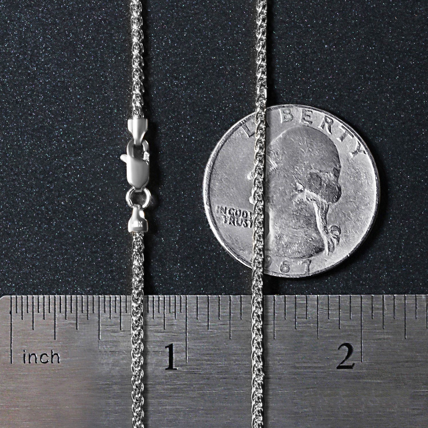 This round wheat chain comes in 14k white gold and has a width of 1.5 millimeters.