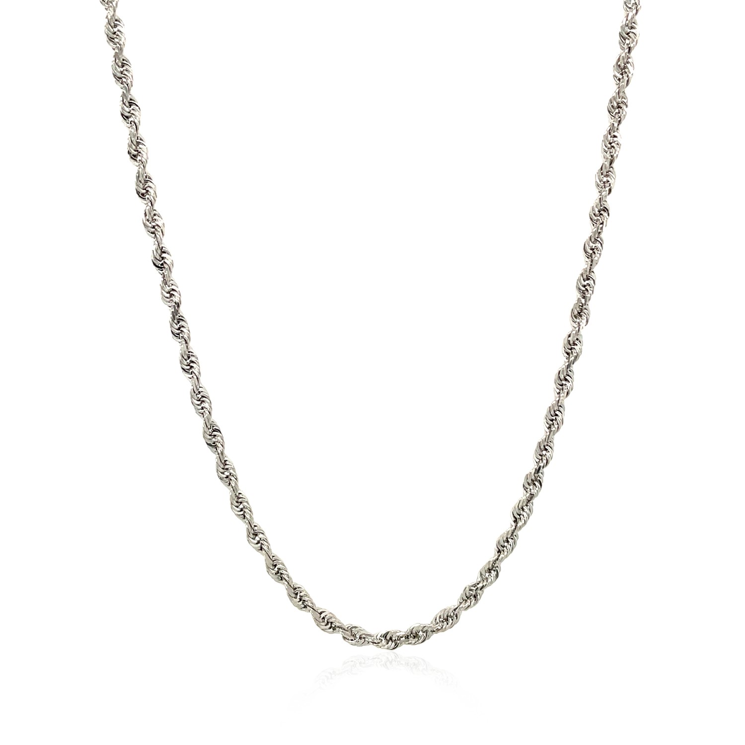 This solid diamond cut rope chain comes in 14k white gold and has a width of 2.5 millimeters.