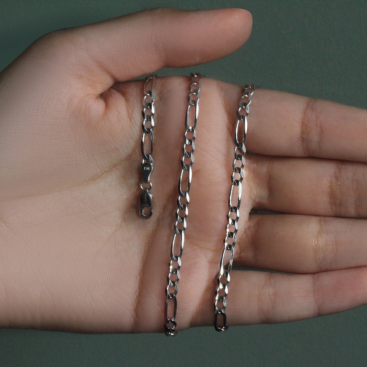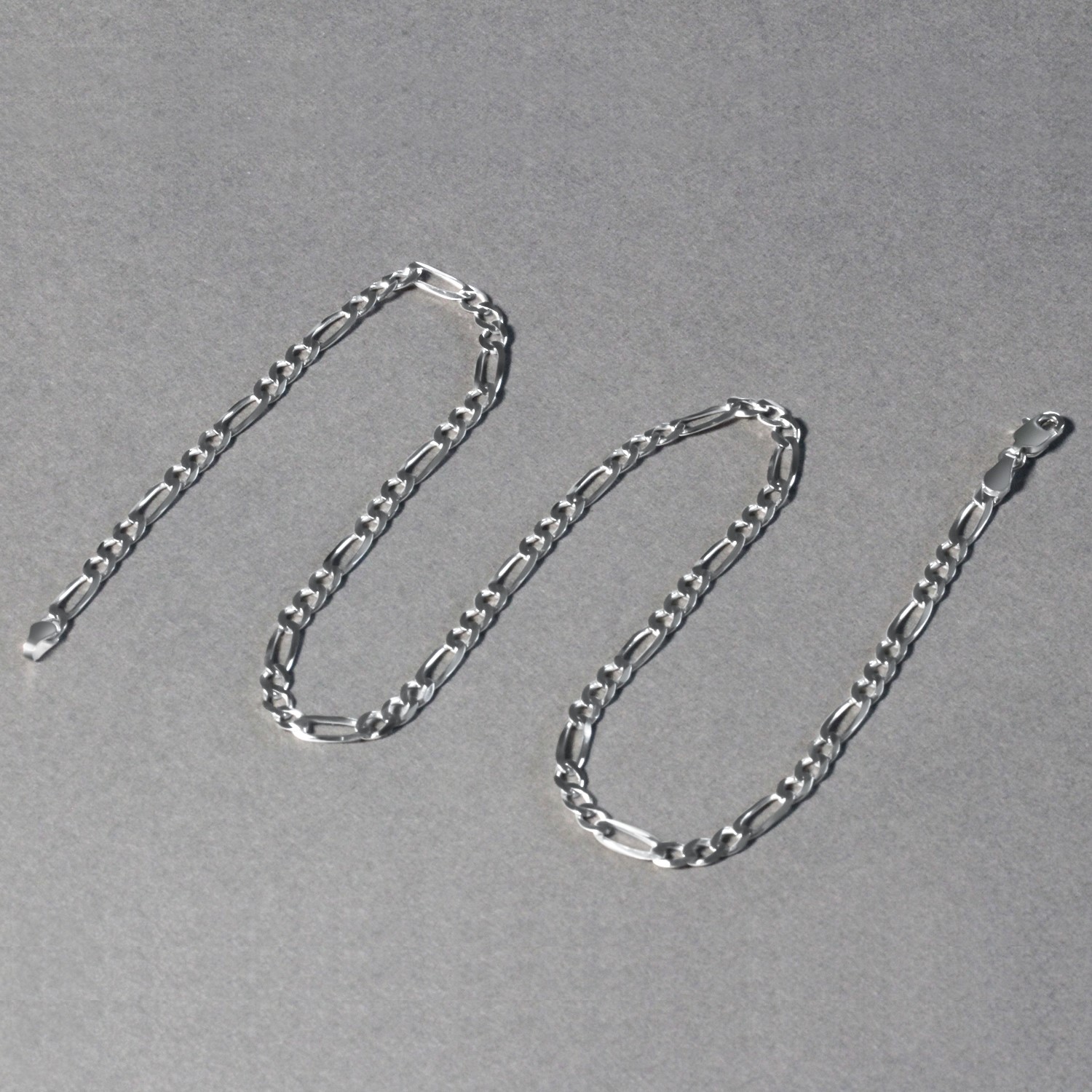This solid Figaro chain comes in 14k white gold and has a width of 3.80 millimeters.