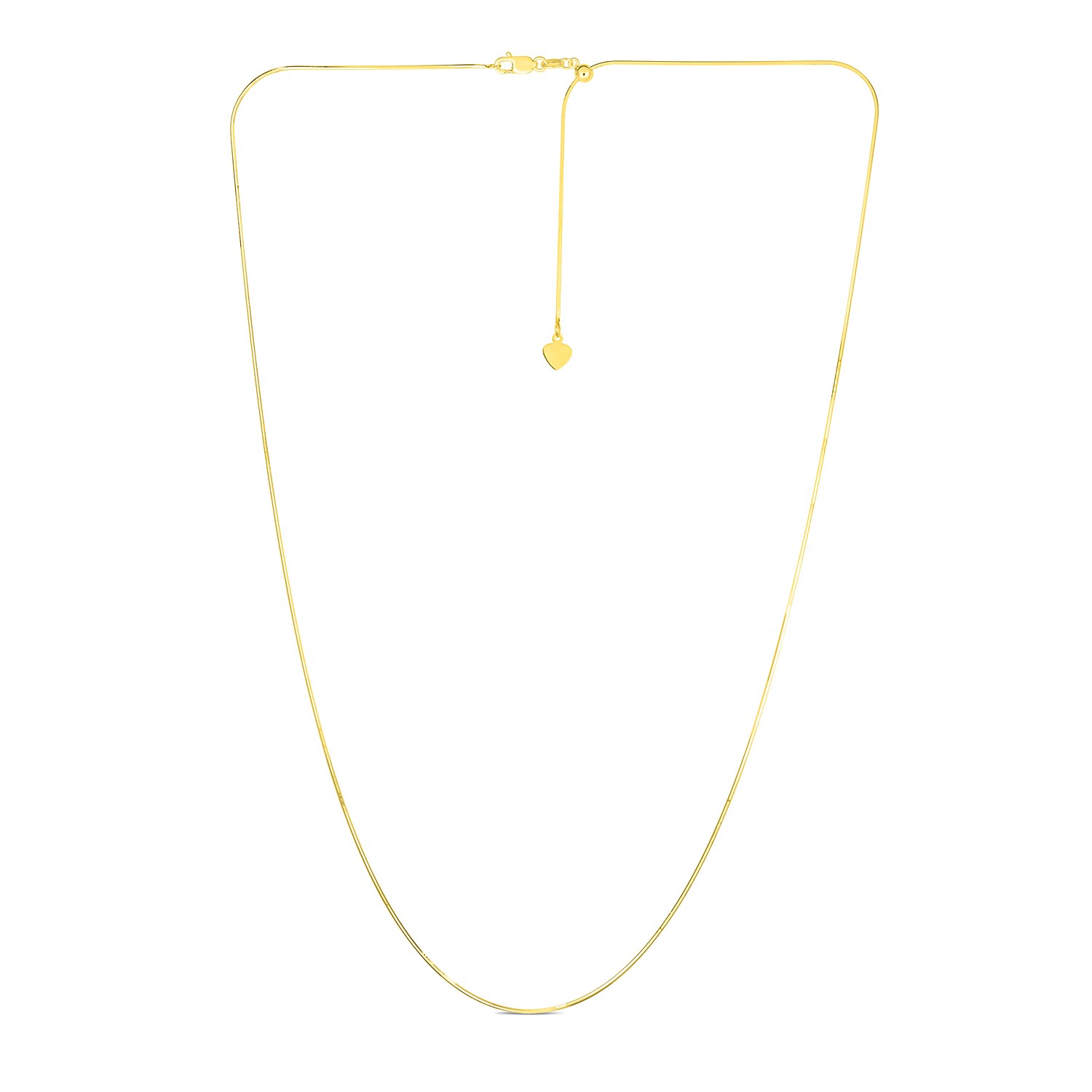 14k yellow gold, this adjustable snake chain measures a width of 0.80 millimeters and features a heart dangle accent. The chain is adjustable up to 22 inches and is fastened securely with a lobster clasp.