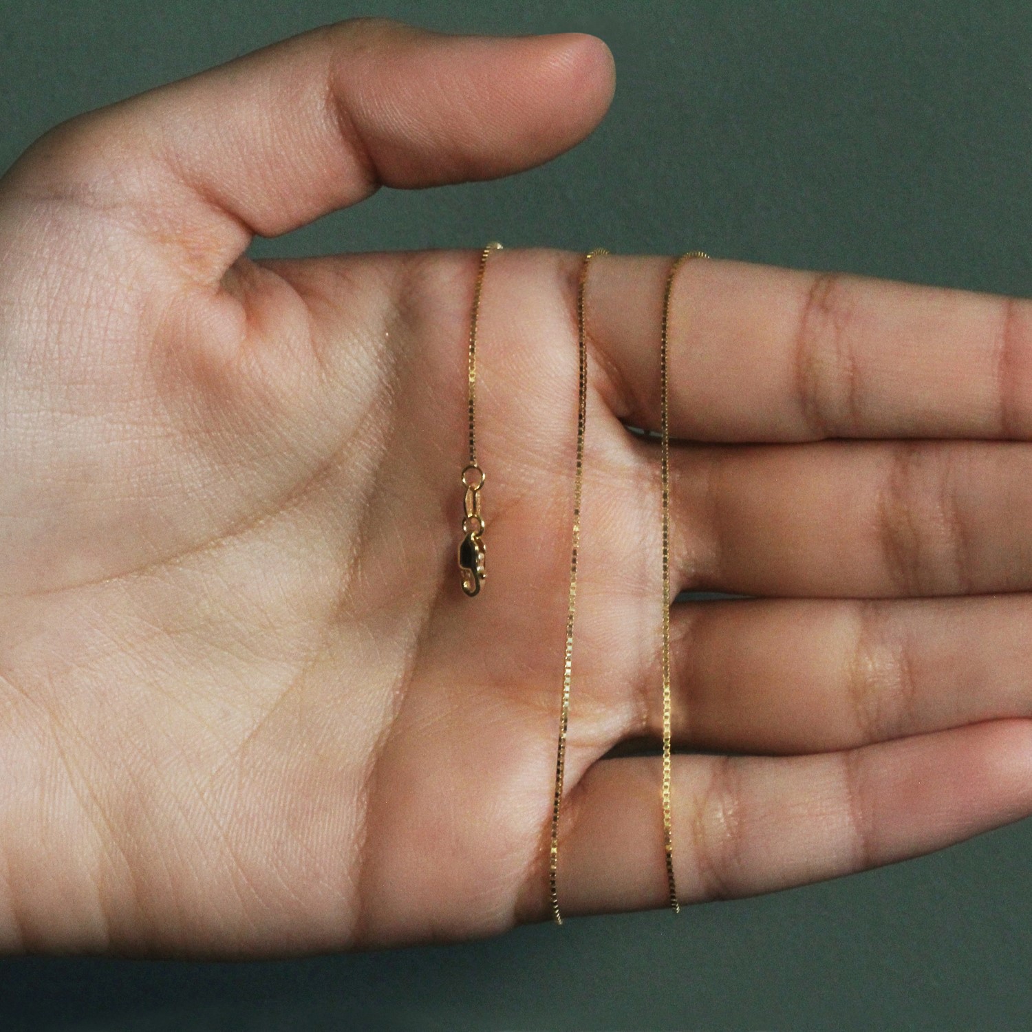 This classic box chain comes in 14k yellow gold and has a width of 0.68 millimeters.