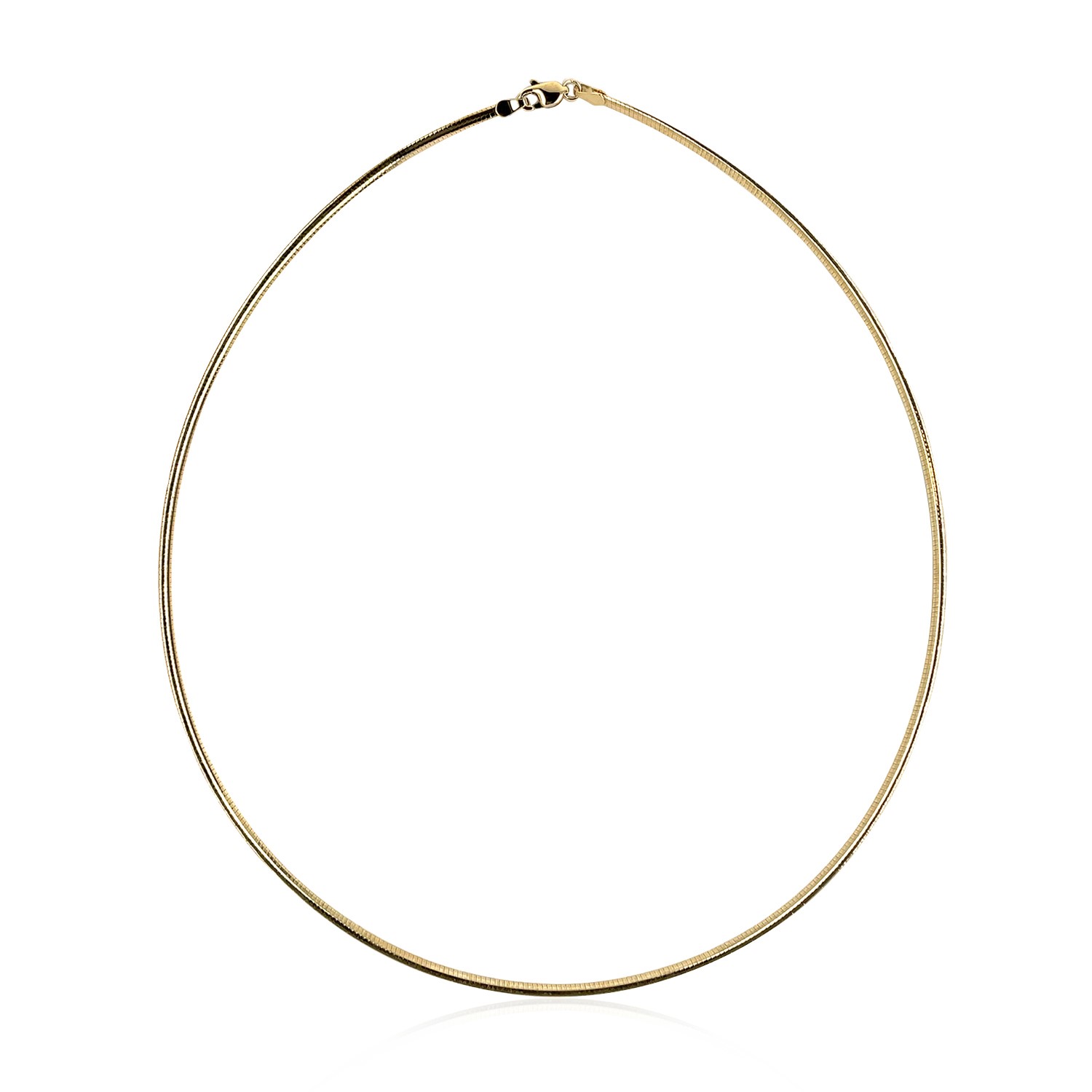 A slim classic omega chain is radiating delicate elegance crafted in 14k yellow gold; this sparkler comes in sizes 16 inches and 18 inches.