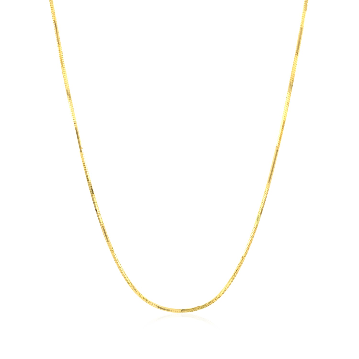 This octagonal shiny snake chain comes in 14k yellow gold and has a width of 0.85 millimeters.