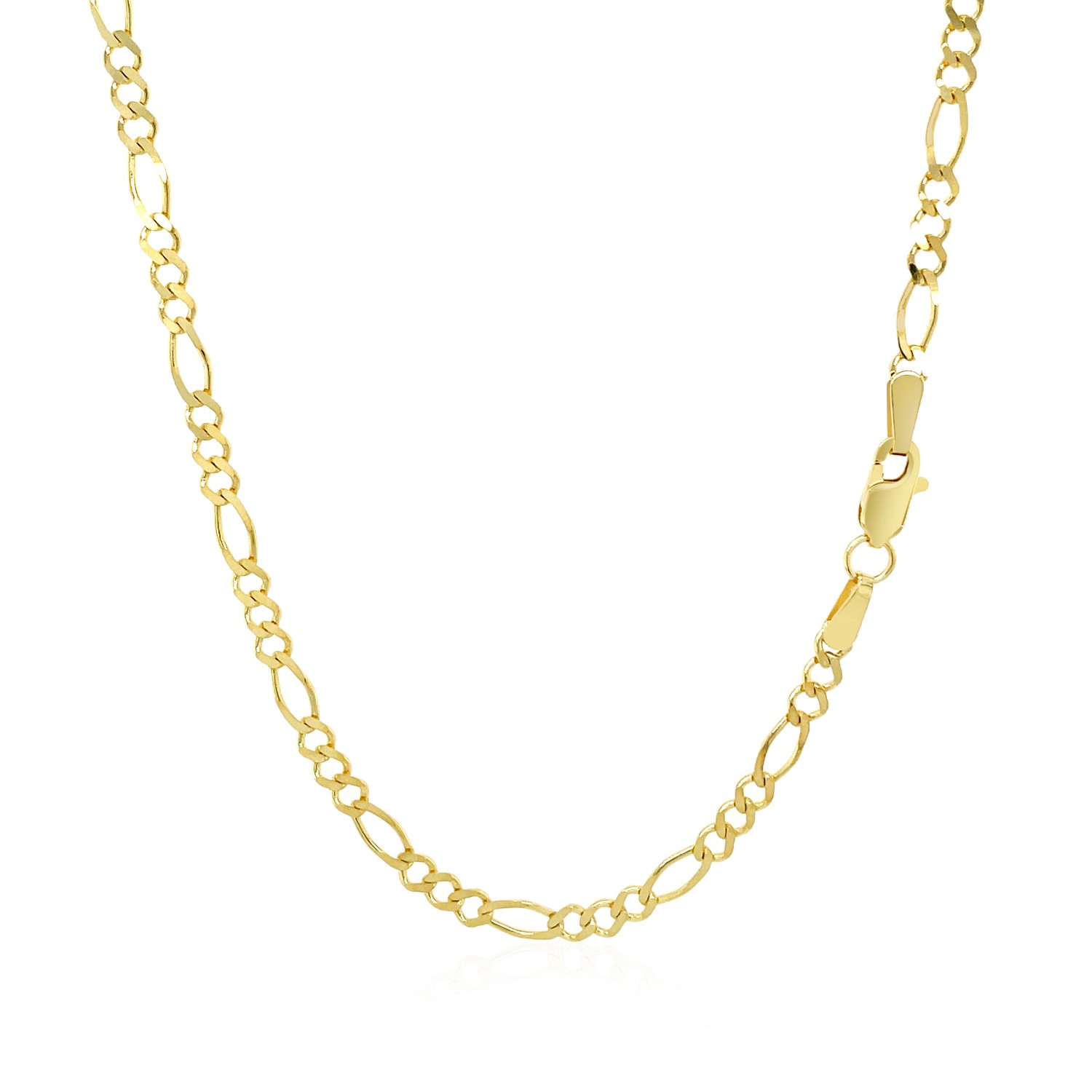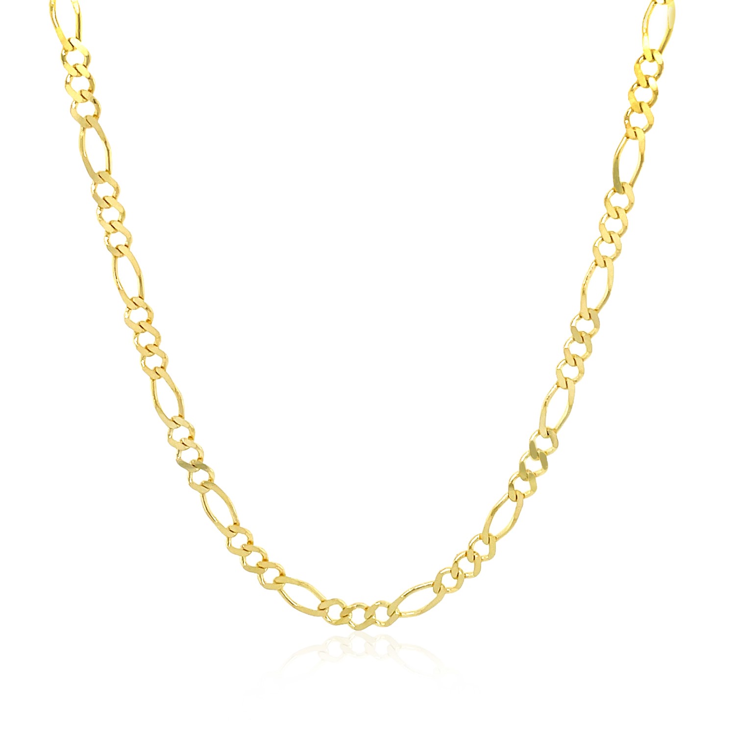 This solid Figaro chain comes in 14k yellow gold and has a width of 2.80 millimeters.