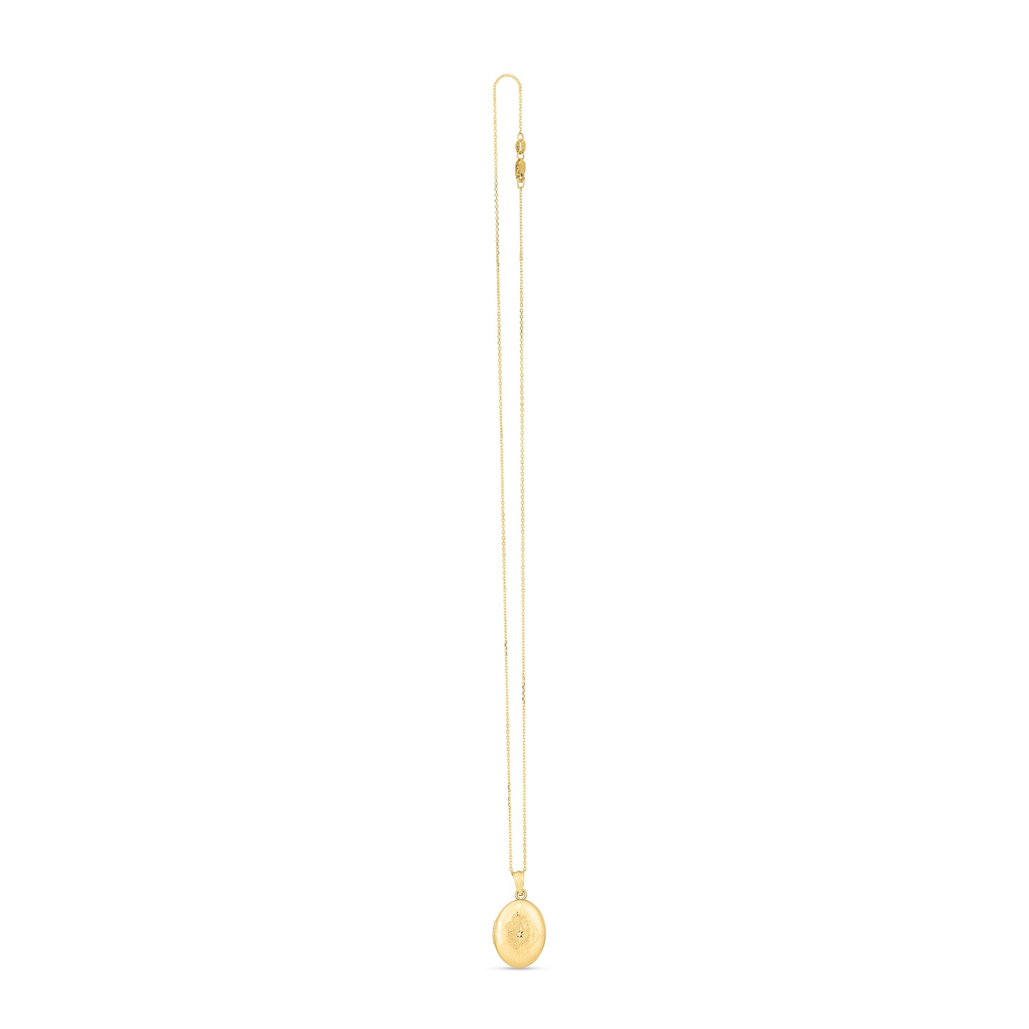 This beautiful 14k yellow gold Oval Etched Locket necklace sits close to the heart. It comes in a high polish finish & closes with a lobster clasp. This stunning piece is hand crafted & sits effortlessly between a glimmering rolo chain. A small diamond & a beautiful etched design gives you a unique piece to add to any collection. Measuring 18 inches in length.