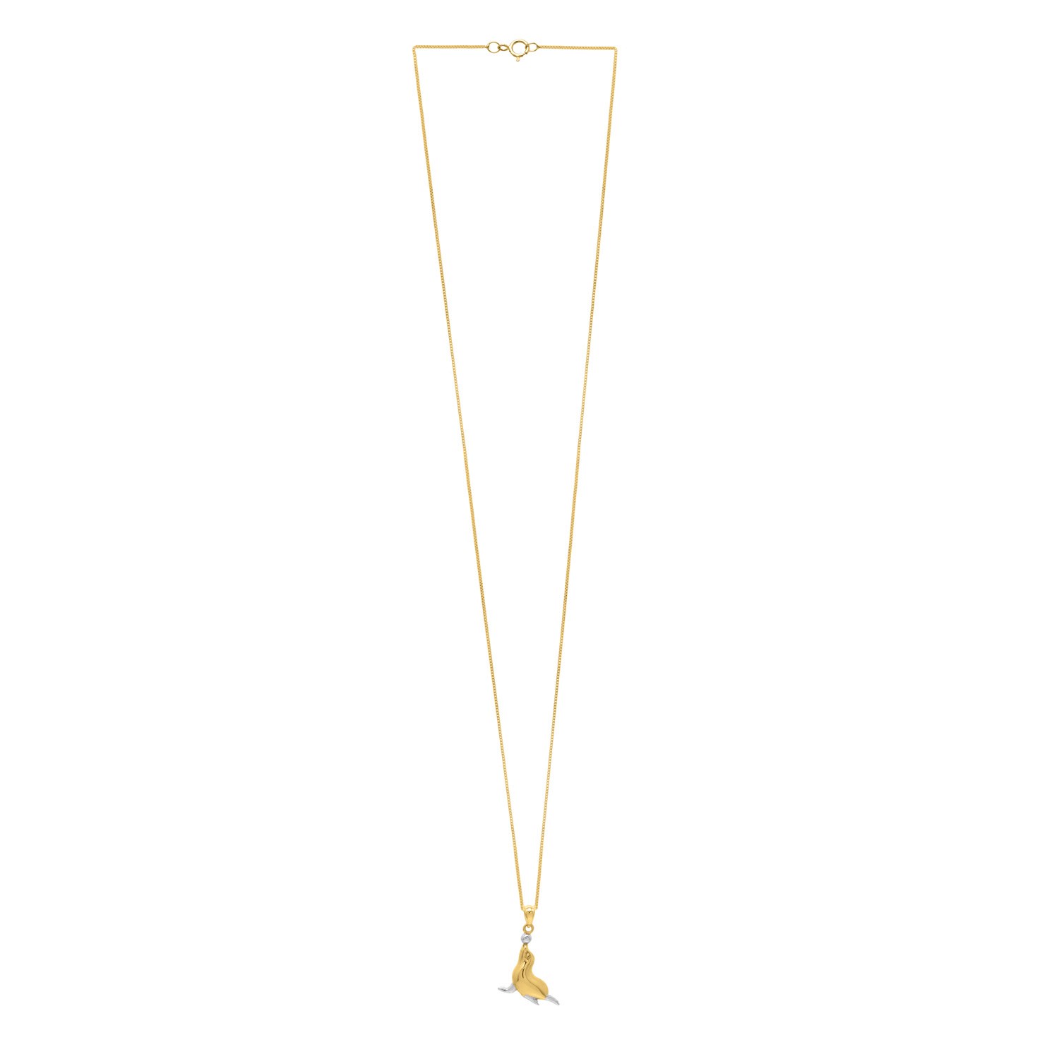Bringing a touch of playfulness, this 10k two-tone gold necklace features a polished seal pendant that captures the spirit of these delightful marine animals. Suspended on an 18 inches chain with a spring ring clasp, it’s a radiant accessory that celebrates the joy and beauty of ocean life.