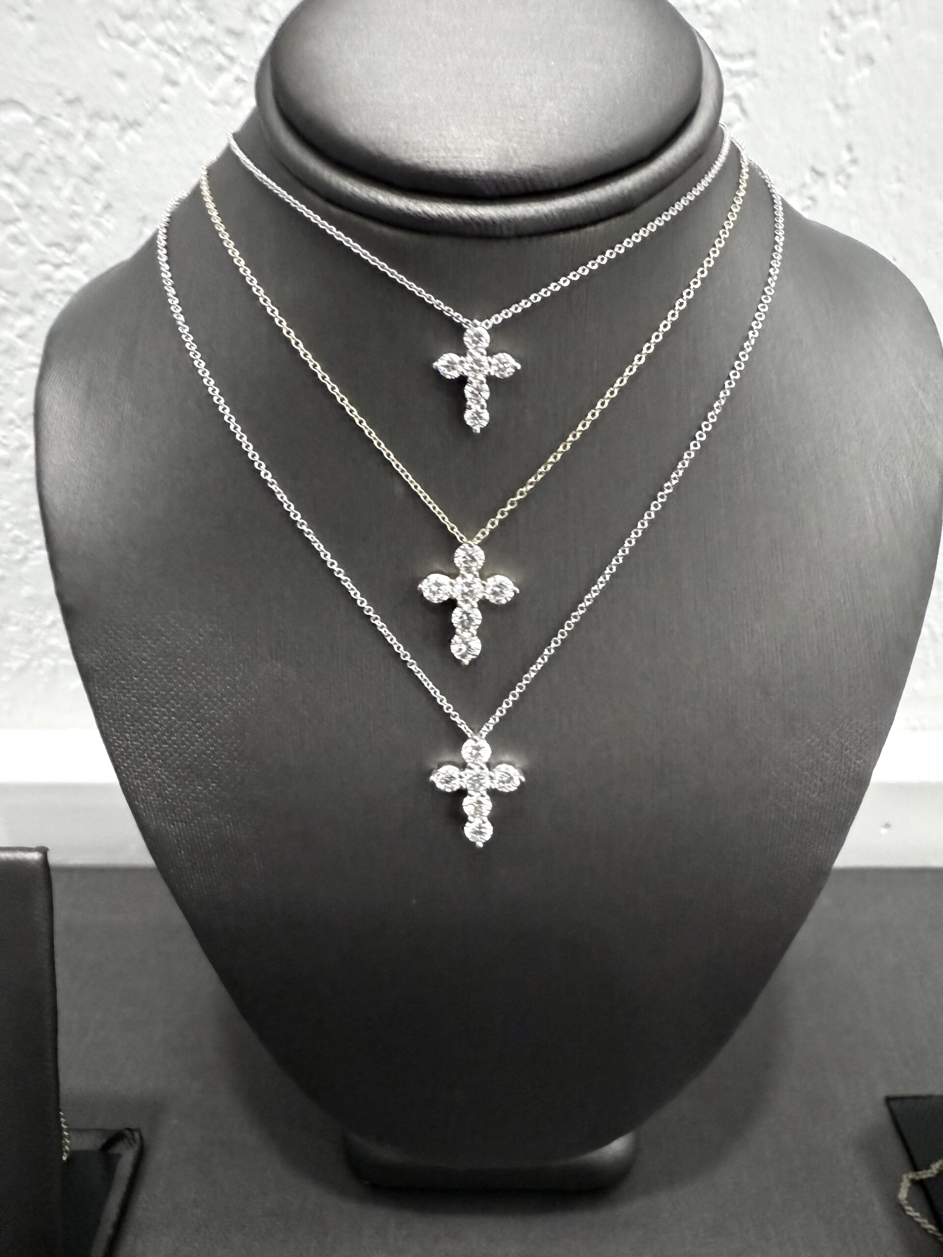 .42 carat lab grown diamond cross pendant set in 14 karat white gold set with 6 round diamonds set in shared prongs with F color and VS clarity. The chain measures 18 inches long and the diamonds 2.7 to 2.9 MM.