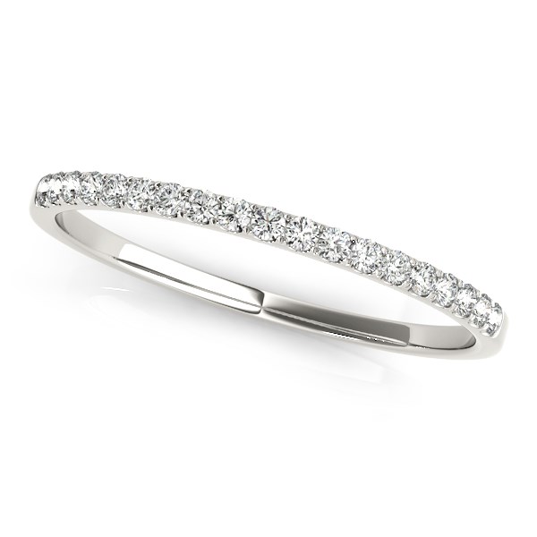 A classic wedding band showcasing pave set with round diamonds made of 14k white gold.