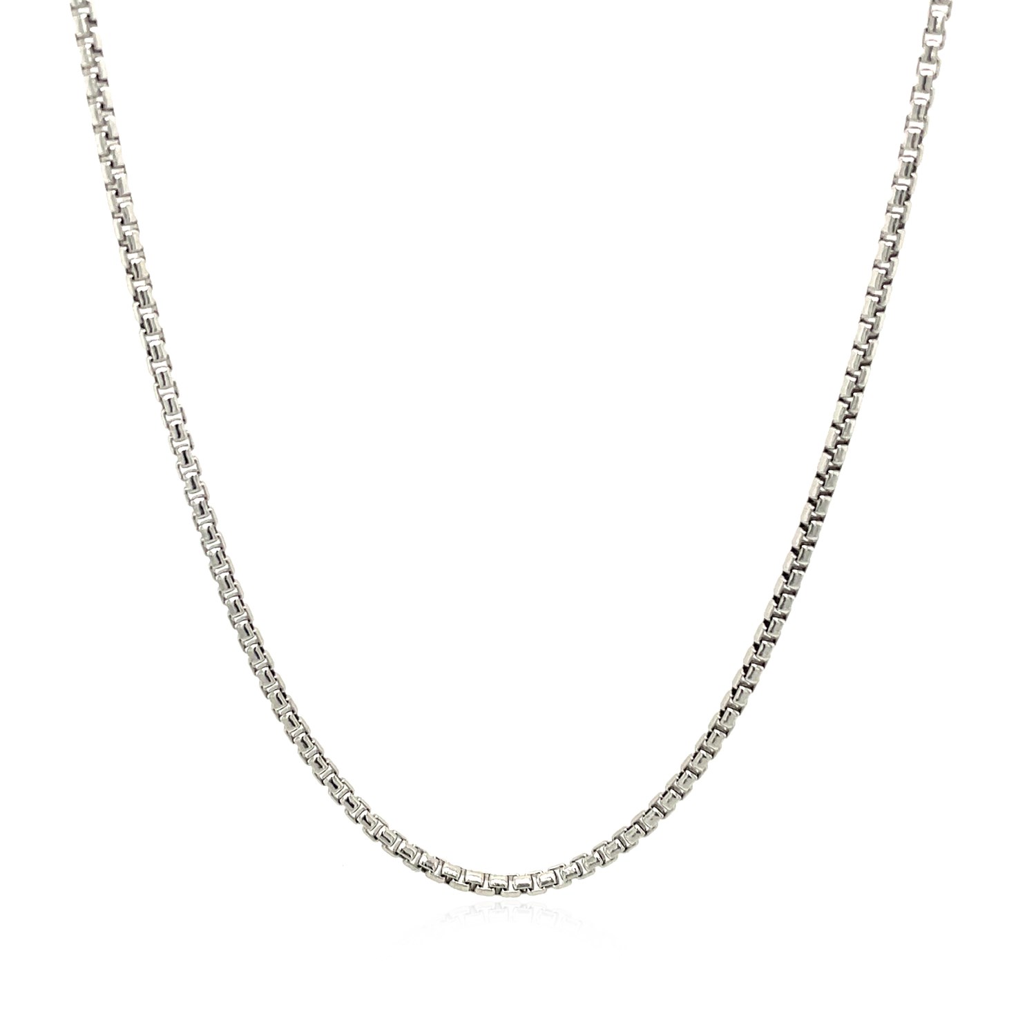 This rhodium-plated round box chain comes in sterling silver and has a width of 1.5 millimeters.