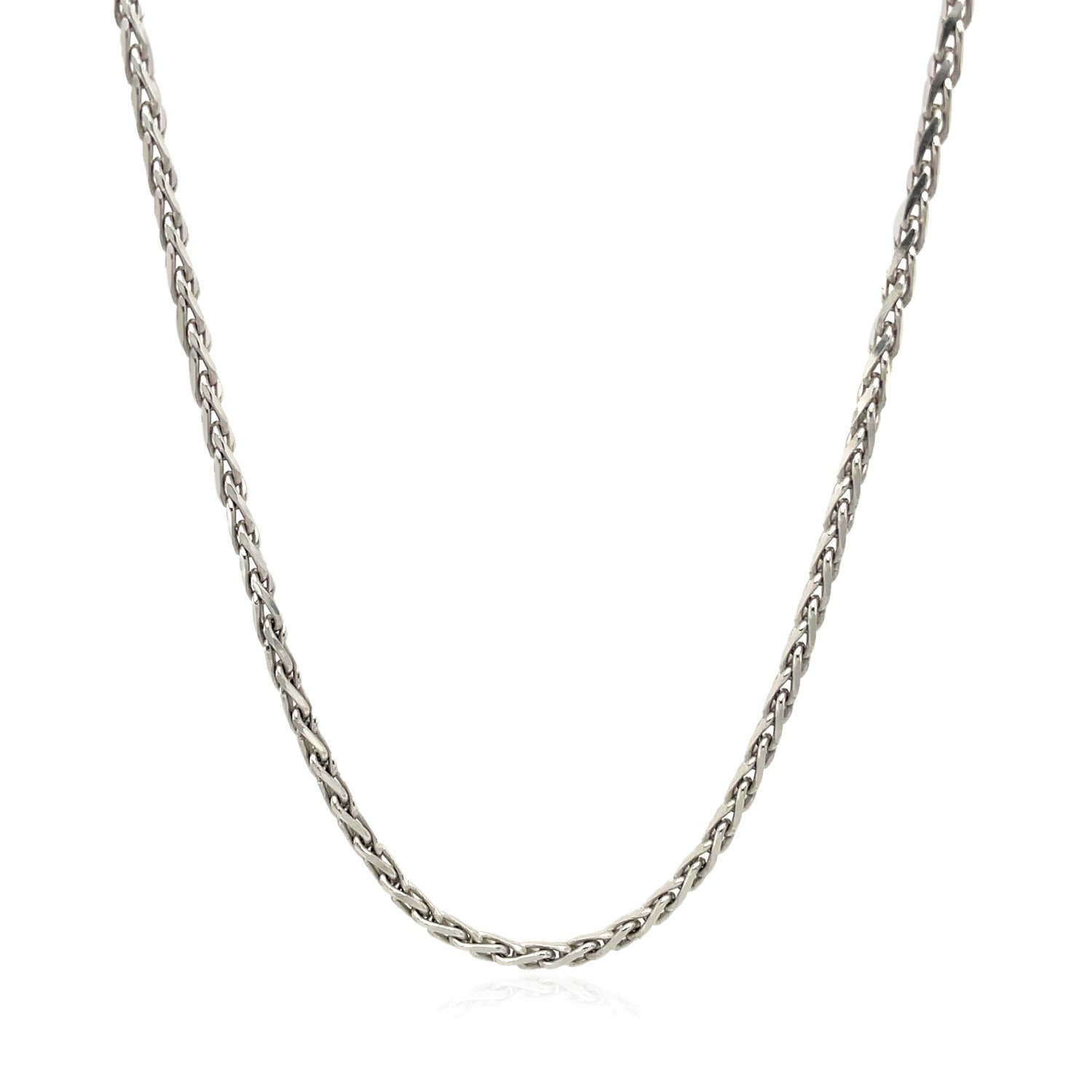 This rhodium-plated wheat chain comes in sterling silver and has a width of 2.2 millimeters.
