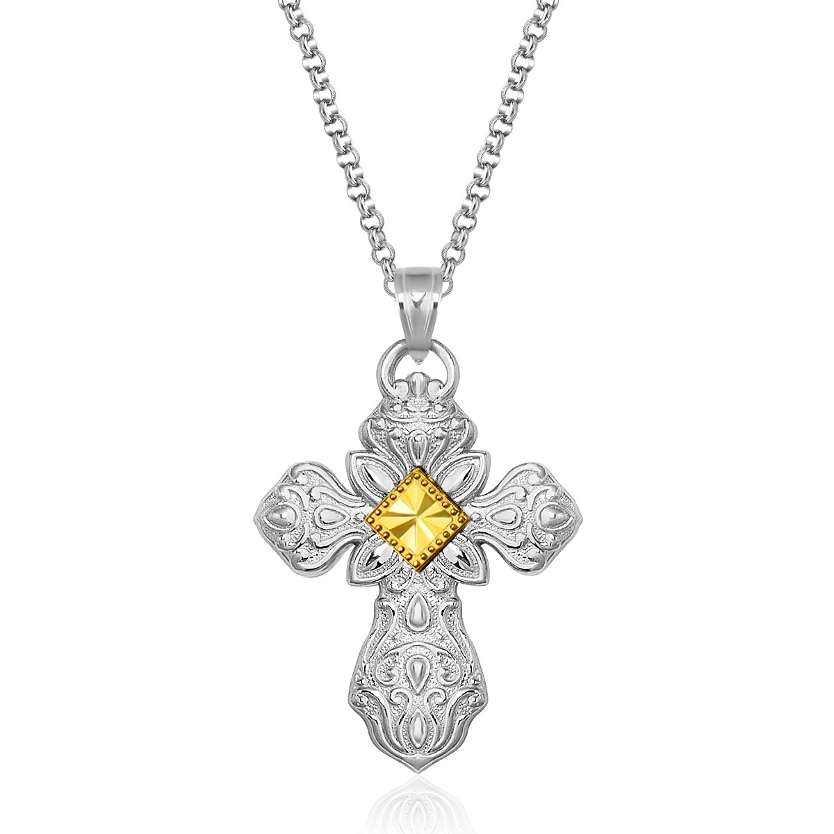 Elaborately detailed, this expertly crafted silver cross features an attractive pattern of scrolls and shapes while the 14K gold center element provides a striking focal point. An 18″ cable chain is included.